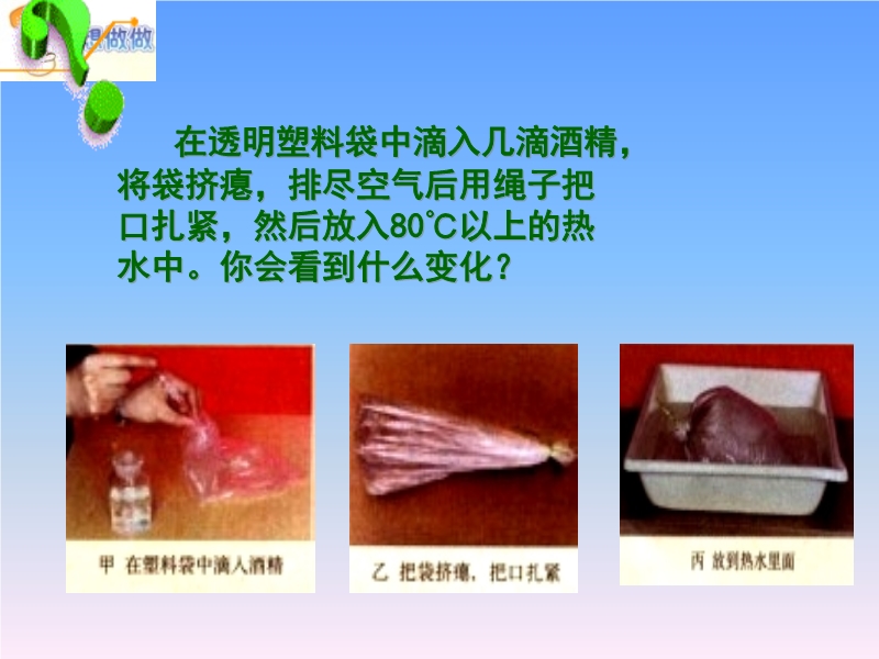 【内容简介】人教版《3.3汽化和液化》PPT+flash+视频 ,课件展示了生活中的液化和汽化现象,引导学生探究了沸腾的现象及沸腾的特点,探究了蒸发的特点及影响蒸发的因素等.
