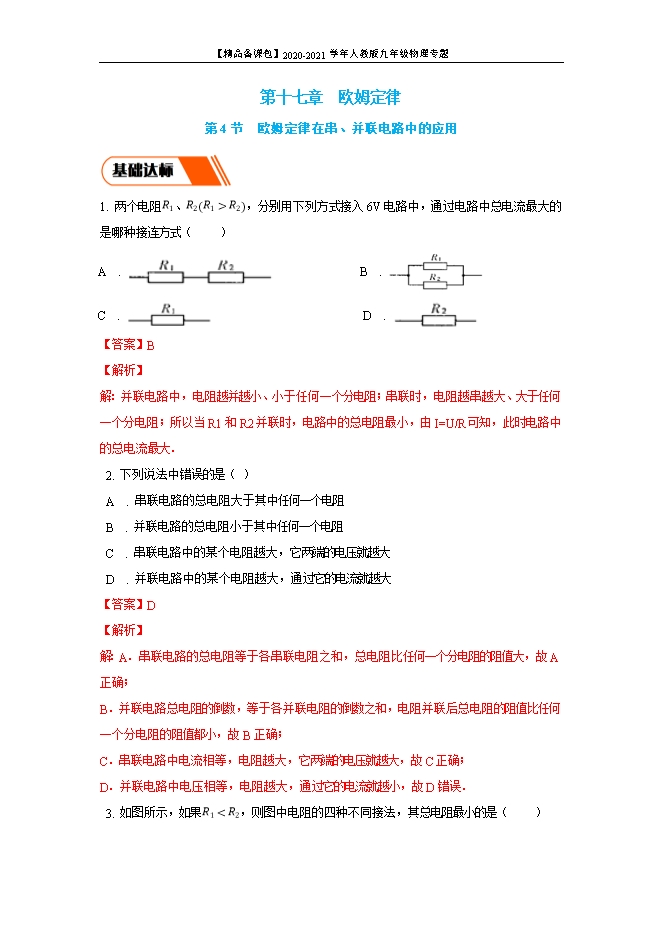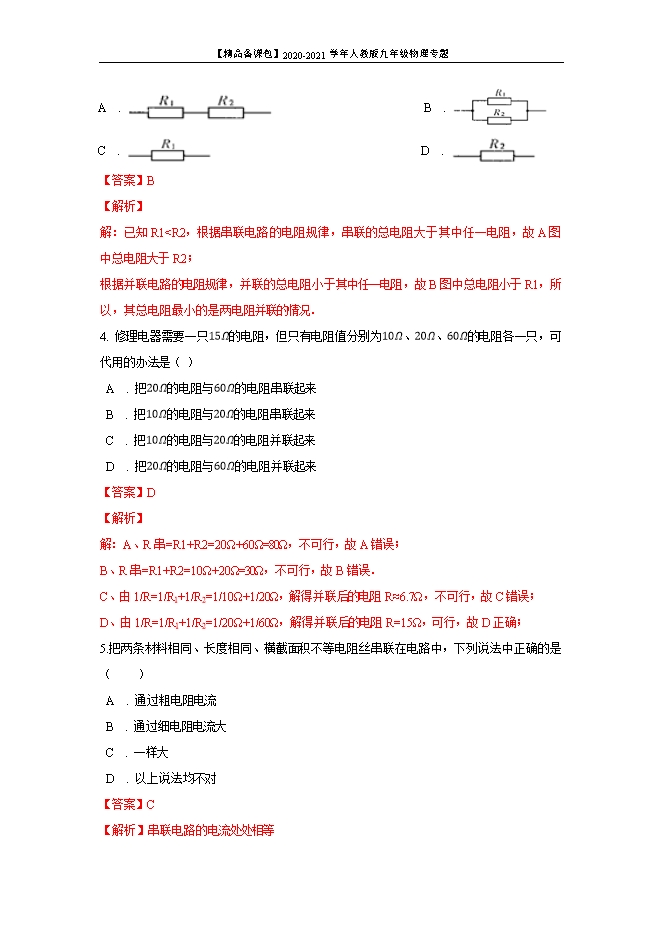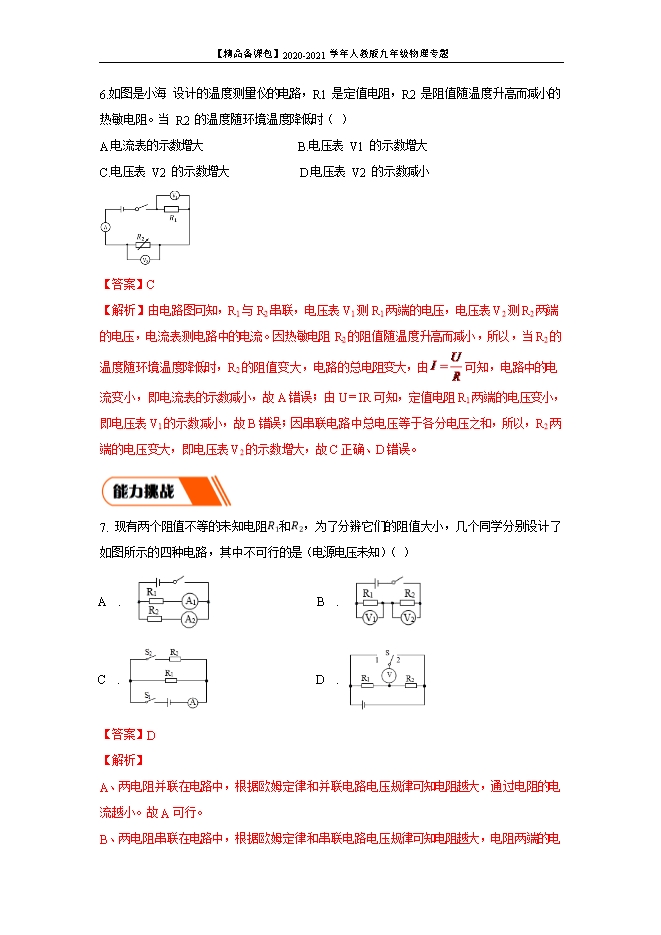 - 1325【精品专题】2020-2021学年九年级物理同步专题剖析:21 欧姆定律的动态电路分析(原卷版和解析…