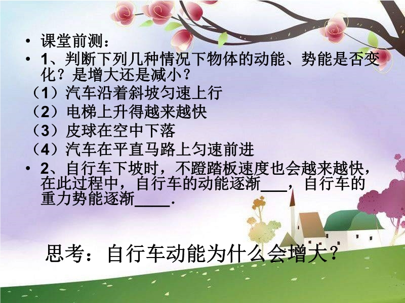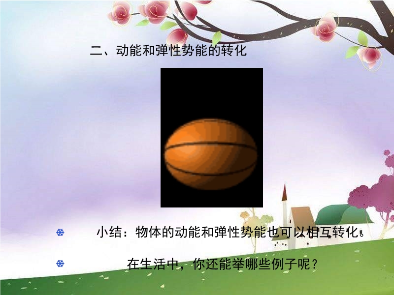 【内容简介】市级优课:教科版《12.2机械能的转化》ppt+教学设计+视频,共有22张幻灯片。课件再现了生活中的能的转化的实例,展示了动能与重力势能的相互转化、动能与弹性势能的转化等,事例接近生活,学生更容易理解,课件还精选了巩固练习。