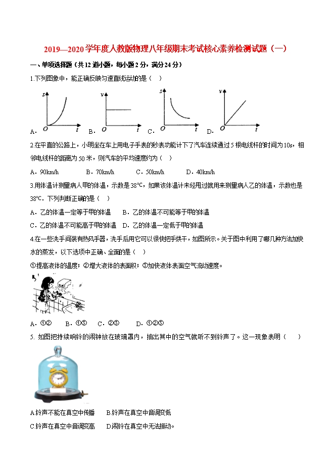 - 335(人教版)2019-2020学年八年级上册物理精讲精练:期末考试核心素养检测试题(一)