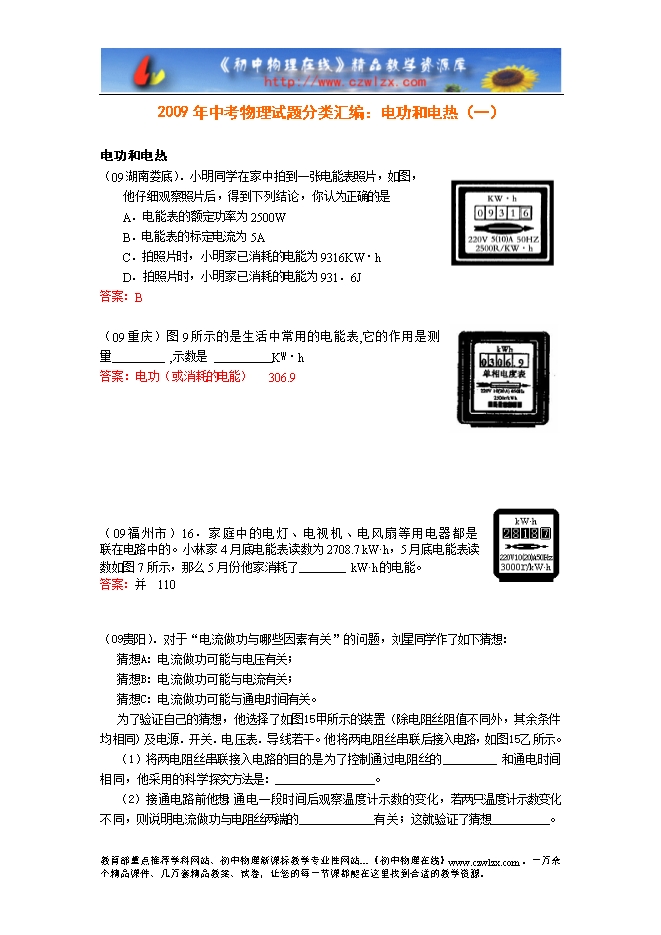 2009年中考物理试题分类汇编:计算综合和开放专题