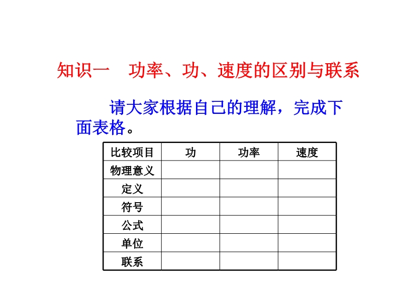 【内容简介】 1、功率定义:单位时间所做的功叫功率。 2、功率的物理意义:表示物体做功快慢的物理量。 3、公式:P=W/t。P:功率,单位—瓦特,符号—W;W:功,单位—焦耳,符号—J;t:时间,单位—秒,符号—s。 功率单位:瓦特,简称瓦,符号W,功率还常用单位:千瓦(kW),兆瓦(MW) 1kW=1000W, 1MW=1000kW 1W的物理意义:表示物体在1s内所做的功是1J。功率的计算 例题1:建筑工地上,水泥板质量为0.7t,起重机在15s内把它匀速提升到4m的高度,起重机提升重物的功率是多少?(g=10N/kg结果保留一位小数)