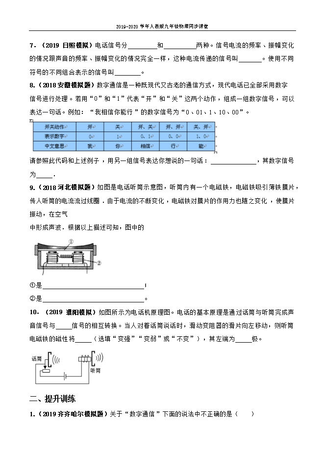 【精品】2019-2020学年人教版九年级物理同步课堂:21.1现代顺风耳—电话(课件 教案 导学案 练习)
