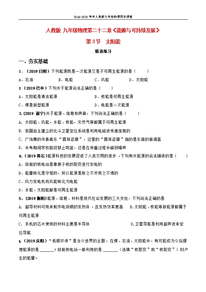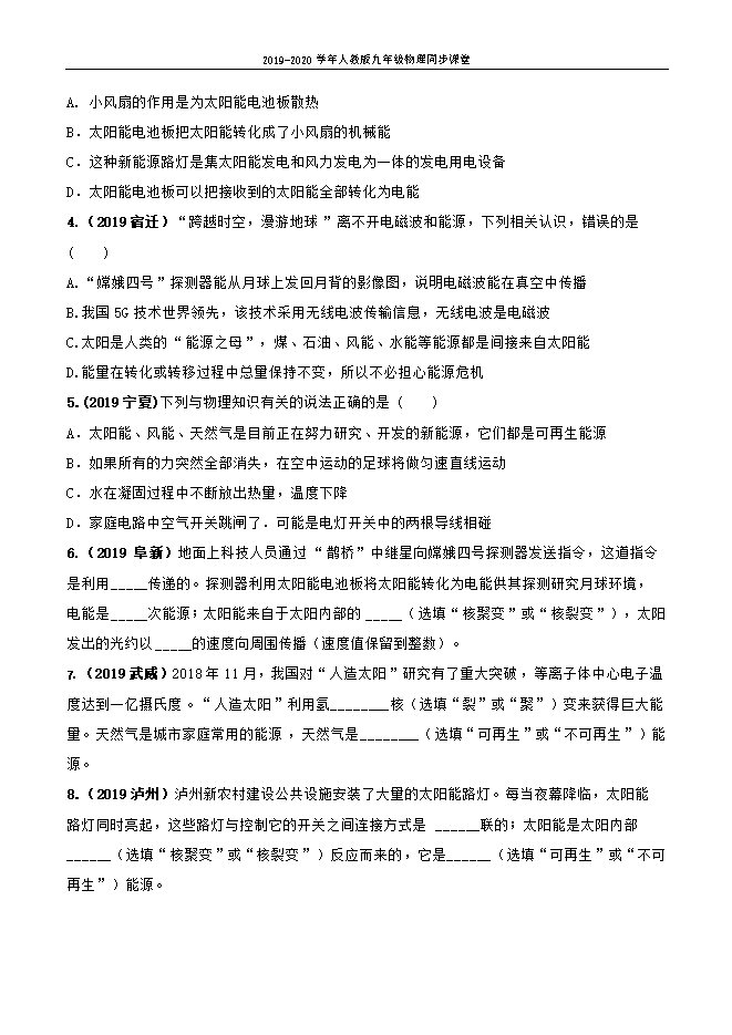 【精品】2019-2020学年人教版九年级物理同步课堂:22.3太阳能(课件 教案 导学案 练习)