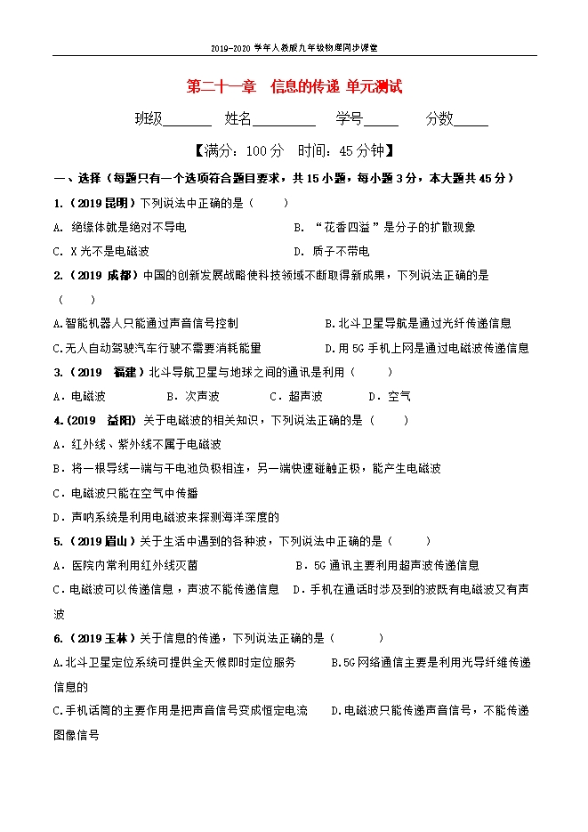 【精品】2019-2020学年人教版九年级物理同步课堂:第21章 信息的传递(单元总结与单元测试)