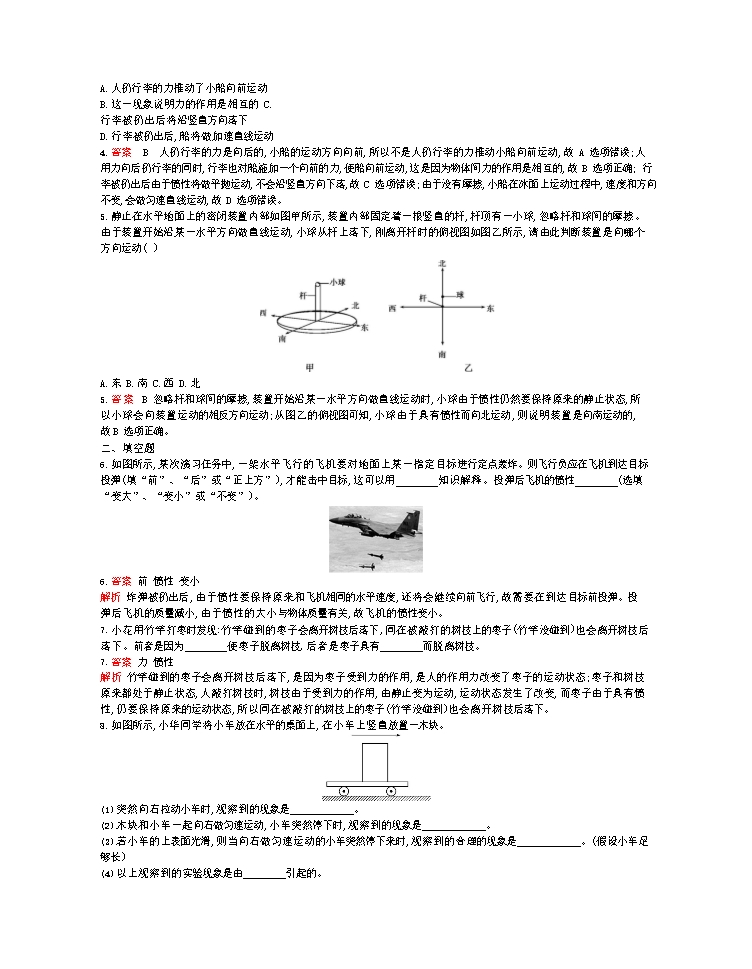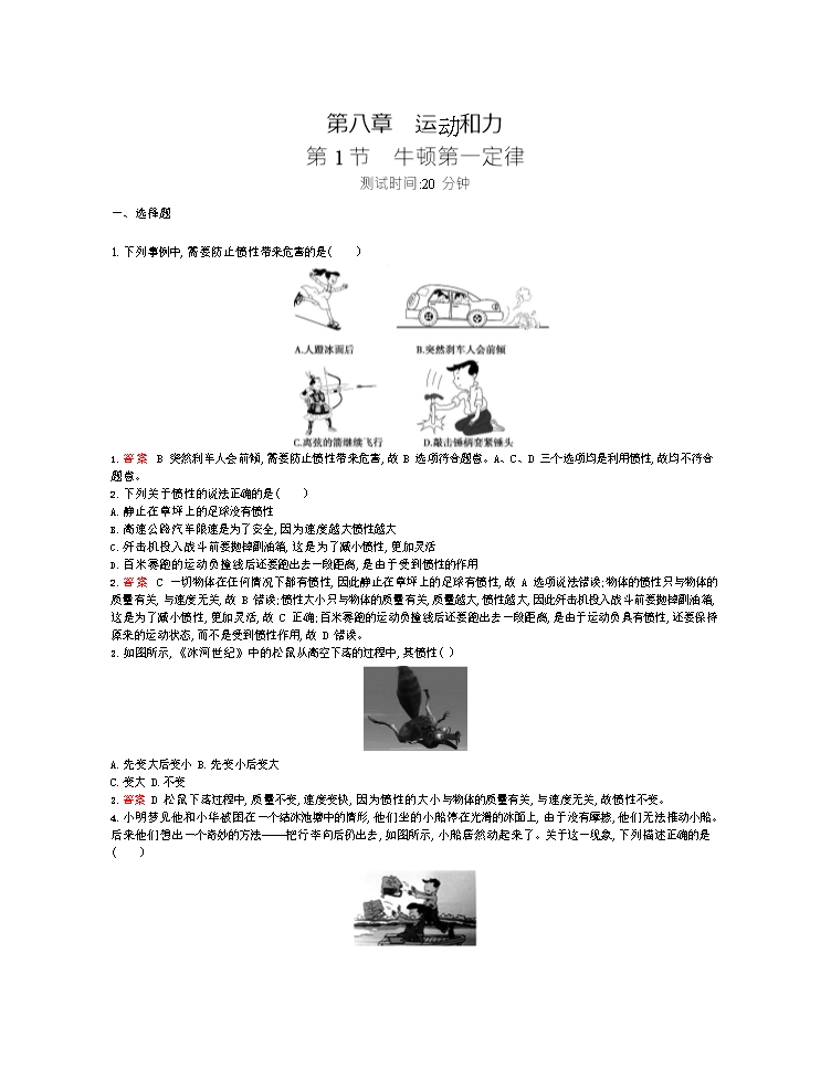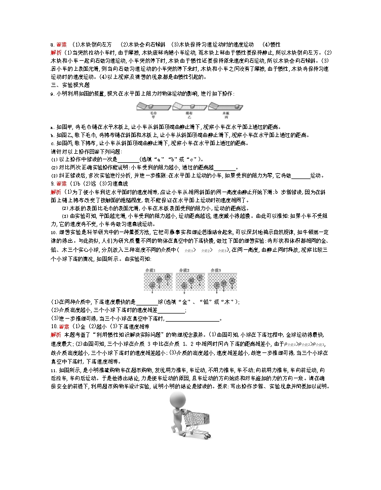 【内容简介】类型一 浮力大小的比较命题点:(1)利用阿基米德原理比较浮力;(2)利用物体浮沉条件比较浮力。例1 如图a、b、c三个实心小球,其中a与b质量相等,b与c体积相同;将三个小球放入水中静止不动时,a球漂浮、b球悬浮、c球沉底。则下列判断中正确的是( ) A.它们在水中的体积关系是:Va<Vb=VcB.它们的重力关系是:Ga=Gb>GcC.它们的密度关系是:ρa<ρb<ρcD.它们所受的浮力关系是:Fa>Fb=Fc解析:由图可知,a漂浮,b悬浮,则V排a<Va,V排b=Vb,当物体的重力等于受到的浮力时物体悬浮或漂浮,Fa=Ga,Fb=Gb;a与b质量相等,则物体的重力相等,所以浮力Fa=Fb,由F浮=ρgV排,所以V排a=V排b,由题干可知:Vb=Vc,V排a=V排b=V排c,故A错误;b悬浮,c沉入底部,所以Fb=Gb,Fc<Gc;b与c体积相同,根据F浮=ρgV排可知:Fb=Fc,Gb<Gc;则Ga=Gb<Gc,故B错误;当物体的密度大于液体的密度时物体下沉,当物体的密度等于液体的密度时物体悬浮,当物体的密度小于液体的密度时物体上浮或漂浮,根据a漂浮、b悬浮、c沉入底部可知:ρa<ρb<ρc,故C正确;由上述分析可知:浮力Fa=Fb=Fc,故D错误。答案:C类型二 求密度的大小命题点:(1)求液体的密度;(2)求物体的密度。例2 如图a所示,一长方体木块质量为0.12kg,高为4.0cm;将木块平稳地放在水面上,静止时木块露出水面的高度为2.0cm,如图b所示,利用金属块和细线,使木块浸没水中且保持静止状态。已知水的密度ρ水=1.0×103kg/m3,g取10N/kg,求:.........