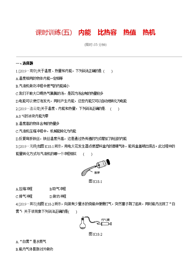 第5课时 《内能、比热容、热值、热机》--2020年苏科版中考物理专题复习课件与课时训练