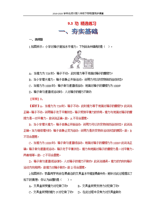【精品】2019-2020学年北师大版八年级下册物理同步课堂:9.3功(课件 精选练习)
