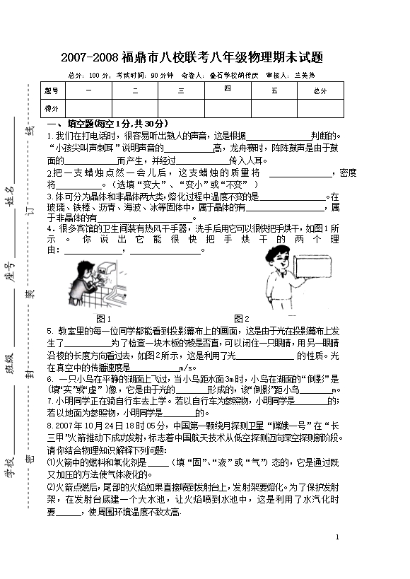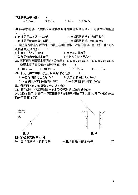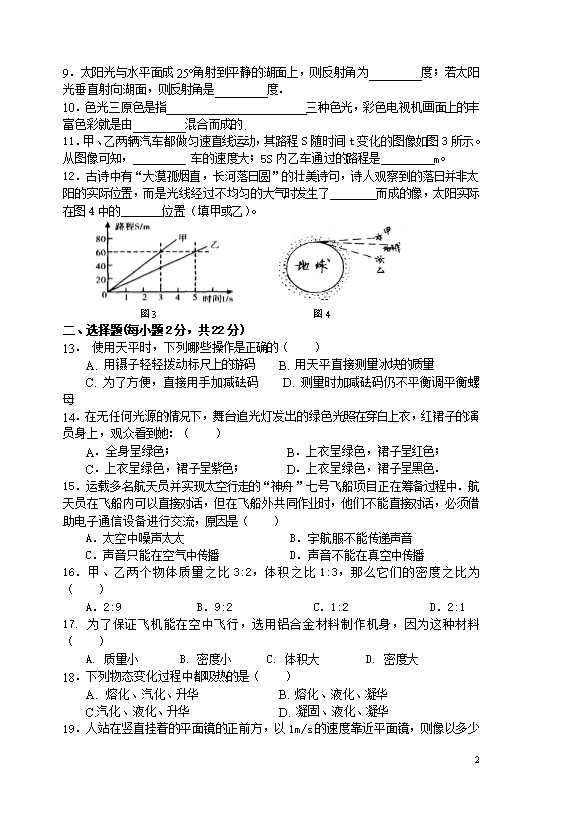 【内容简介】注意:木试卷分试题卷和答题卡两部分,考试时间60分钟,满分70分.考生应首先阅读试题卷上的文字信息,然后在答题卡上作答,在试题卷上作答无效,交卷时只交答题卡.一、填空题(本题共6小题,每空1分,共14分)1.煤、石油、风能、水能、太阳能都是能源家族中一员,其中属于“绿色”能源的有,请举出其中一种“绿色”能源的一项应用: 。2.“墙角数枝梅,凌寒独自开.遥知不是雪,为有暗香来”诗中梅花在远处隐隐的传来阵阵香气,这是因为花香分子在做;从不同角度都能观赏花,是由于光在花的表面发生了现象;清风吹过,花瓣飘落,说明力可以改变物体的。3.地球同步卫星利用(选填“超声波”或“电磁波”)传递信息;为其提供能量的装置是太阳能电池板,其能量转化过程是。4.防空警报是城市民防工程的重要组成部分,警报声是由物体的产生,以声波的形式在介质中传播;关闭门窗声音变小,这是在减弱声音。5.如图所示的电路中,电源电压不变,R2=20Ω.开关S1、S3闭合,S2断开时电流表的示数为0.5A,S1闭合,S2、S3断开时,电流表的示数为0.3A.则电源电压U=V,电阻R1=Ω.当开关S1、S3断开,S2闭合时,电路中1min消耗的电能为J。 第5题图 第6题图6.如图所示,一轻杆左端挂--矩形塑料框A,右端挂一外形相同的金属框B,处在一方向垂直纸面向里的磁场区域(用“×”表示磁感线)内,以0为支点在水平位置静止.现使此装置竖直匀速上升,当A、B框上端一间刚离开磁场时,发现杆沿顺时针方向转动,请你分析并推测此现象产生的原因:;若将磁场方向改为垂直纸面向外,重复上述操作,杆将沿(选填“顺时针”或“逆时针”)方向转动。二、选择题(本题共8小题,每小题2分,共16分.第7~12题每小题只有一个选项符合题目要求,第13~14题每小题有两个选项符合题目要求,全部选对得2分,选对但不全得1分,有选错的得0分.请将其字母代号填在答题卡相应位置.)7.下列说法错误的是( )A.钓鱼竿是省力杠杆B.验电器的工作原理是“同种电荷相互排斥”C.电子绕原子核运动与地球绕太阳运动相似D.人的正常体温为36.5℃8.扎马步是中国功夫的基本功,好处是锻炼耐力,加强下盘力量和稳定性,如图所示为一武术爱好者扎马步时的姿势,下列说法正确的是( )A.他对地面的压力是由于鞋子形变产生的B.若他其中一只脚对地面压强为p,则他对地面压强为2pC.当他静止不动时,每只脚对地面的压力都等于他的重力D.当他静止不动时,他受到的重力和他对地面的压力是一对平衡力 ........