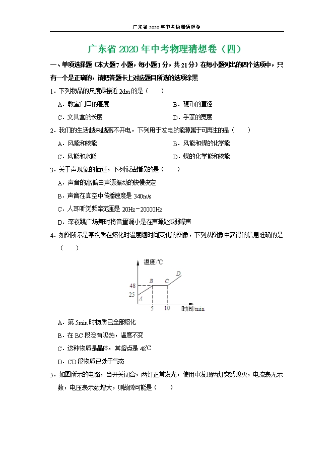 广东省2020年中考物理猜想卷(四)(原卷版和解析版)