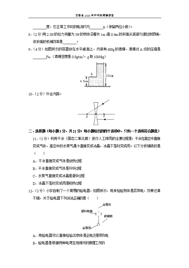【内容简介】一、填空题(本题共6小题,每空1分,共14分)1.(2分)暑期小杰同学到海边游玩,烈日当空他会发现脚底沙子很烫,而海水却是凉凉的,这是因为海水的________较大,海水昼夜之间会涨落很多,里面蕴含丰富能量﹣潮汐能,这种能源属于________(选填“可再生能源”“不可再生能源”)。【答案】比热容;可再生能源。【解析】(1)海水比沙子的比热容大,因此,相同质量的海水和沙子,在吸收相同的热量时,沙子温度高,海水温度低,故可以感觉到沙子烫脚,而海水却是凉凉的;(2)潮汐能能从自然界源源不断的获得,是可再生能源。2.(3分)我们走进公园能闻到花的香味,说明分子在________。汽车轮胎有花纹,主要是为了增大________。运动员挥拍击回乒乓球,这主要表明力可以改变物体的________。【答案】不停地做无规则运动;摩擦;运动状态。【解析】在远处能闻到花的香味,这是扩散现象,说明了分子在不停做无规则运动;汽车轮胎表面刻有花纹,主要是为了在压力一定时,通过增大接触面的粗糙程度来增大摩擦力;运动员挥拍击回乒乓球,乒乓球的运动方向和速度发生了改变,这主要是表明力可以改变物体的运动状态;3.(2分)2018年12月8日凌晨,嫦娥四号探测器在西昌卫星发射中心成功发射升空(如图所示)。探测器穿过大气层时,包裹探测器的整流罩与大气层发生剧烈摩擦,温度升高,这是通过________的方式增加了整流罩的内能。地面控制中心通过________(电磁波/超声波)向它发出指令,在探测器返回地球时,重力势能________。 【答案】做功;电磁波;减小。【解析】探测器穿过大气层时,克服摩擦做功,机械能转化为内能,使得整流罩的温度升高,内能变大;地面中心是通过电磁波来传达指令的;在探测器返回地球时,质量不变,高度减小,重力势能减小。4.(2分)如图所示,有两组同样的砖,A组一块,B组两块。每块砖平放时的长:宽:高为4:2:1.A组砖对地面的压力和压强分别为FA和pA;B组砖对地面的压力和压强分别为FB和pB;则:FA ________FB,pA ________pB(选填“>”“=”“<”) 【答案】<;=。【解析】两组砖对地面的压力均等于其重力,即可F=G,A组一块,B组两块,FA=G,FB=2G,.故FA<FB;A组砖侧放,则面积为SA=4×1=4;压强pA= = ,B组砖平放,则面积为SB=4×2=8;压强pB= = = ,则pA=pB。5.(3分)小明家的数字电能表的表盘上标有“1200imp/kW•h“的字样,若小明家仅一只“220V、1000W的电水壶正常工作了10min,则这段时间内该电能表的指示灯闪烁了________次;若电水壶放出热量的70%被水吸收,能将水壶中________kg初温为20℃的水加热至沸腾(在一个标准大气压下)。【答案】200;1.25。......