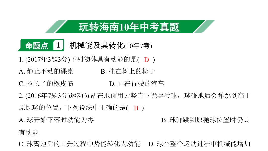 【内容简介】一、单项选择题1.(2020•四川省成都市)如图甲所示 装置,A是重15N的空吊篮,绳子B和C能承受的最大拉力分别为100N和50N。质量为50kg的小张同学将A提升到高处,施加的拉力F随时间变化关系如图乙所示,A上升的速度v随时间变化关系如图丙所示。忽略绳重及摩擦,常数g取10N/kg。下列结论正确的是( ) A. 动滑轮的重力为9NB. 第2s内拉力F的功率为40WC. 此装置最多能匀速运载80N的货物D. 此装置提升重物的最大机械效率为85%【答案】BC【解析】【详解】A.由图丙可知,在1~2s内物体匀速运动,图乙可知,拉力为10N,由图甲知绳子股数n=2,则根据 即 解得G动=5N故A错误;B.第2s内绳子自由端的速度为 第2s内拉力F的功率为 故B正确;C.当拉力最大为50N时,可以拉动物重为 绳子B不断,故C正确;D.由C可得,重物最重为80N,则最大的机械效率为 故D错误。故选BC。2.(2020•河南省)在如图所示的工具中,使用时属于费力杠杆的是( )A. 瓶盖起子B. 食品夹C. 起钉锤D. 核桃夹【答案】B【解析】【详解】A.支点在瓶盖边缘,动力臂较长,是省力杠杆,A项不合题意;B.支点在夹子两壁连接处,动力臂较短,是费力杠杆,选项B符合题意;C.支点是锤子与地面的接触点,动力臂较长,是省力杠杆,C项不合题意;D.支点在夹子两壁连接处,动力臂较长,是省力杠杆,D项不合题意。故选B。3.(2020•湖南省常德市)如图所示,用F1的力将物体B匀速提升h, F1做功600J,若借助滑轮组用F2的力把物体B匀速提升相同高度,F2 做功为1000J。下列说法正确的是( ) A. 两个过程中的拉力F1= 3F2B. F1 做功的功率比F2做功的功率小C. 滑轮组机械效率为40%D. F2 做功的距离为3h【答案】D【解析】【详解】A.F1做功600J,由 可知 由图可知,滑轮组的绳子股数n=3,所以绳子自由端移动的距离s2=3h,F2做功1000J,由 可知 所以 ,故A错误;B.题中没有给出两次运动的时间,所以无法比较两个力做功的功率,故B错误;C.因为用F1的力将物体B匀速提升,所以物体B的重力G等于拉力F1,所以滑轮组的有用功为 滑轮组的总功等于拉力F2做的功,即 所以滑轮组的机械效率 故C错误;D.由图可知,滑轮组的绳子股数n=3,所以绳子自由端移动的距离s2=3h,即F2 做功的距离为3h,故D正确。故选D。