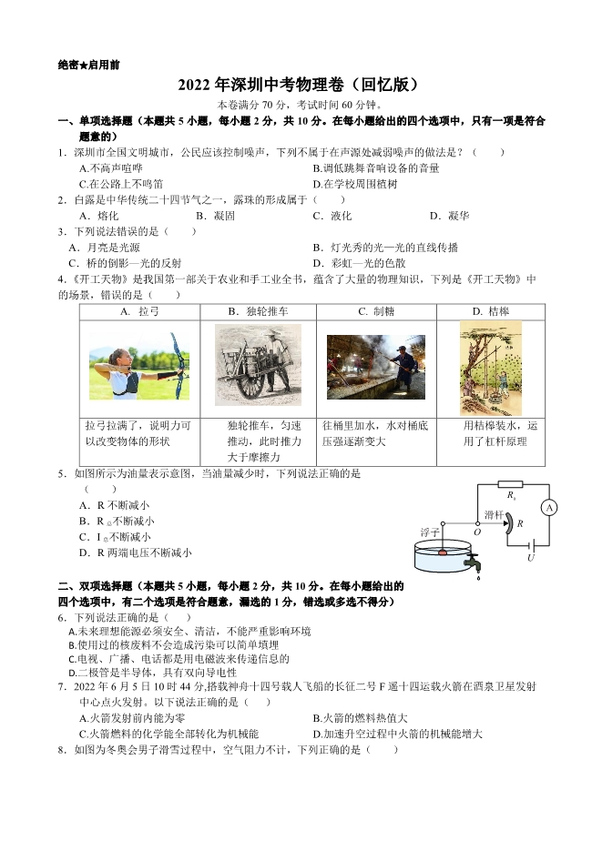 【内容简介】1.求物体的体积:利用公式: 。对于不规则物体(固体)、液体等,在知道其密度情况下,可以通过测量其质量,然后计算出其体积。例如:图(5)是一块不规则石块,已知其密度为3×103kg/m3,用磅秤秤其质量为150kg,则其体积为: 。 图(5)不规则石块2.求物体质量:在知道物体体积和密度时,可以根据 ,求出物体质量。如:为减少大气污染,液化天然气汽车逐步走进我们的生活,如公交车、双燃料私家车等。如果液化天然气密度为0.42g/cm3,私家车储气罐容积为60升,那么一罐气的质量为: 3.鉴别不同物质:密度相同不一定是同一种物质,但是密度不同一定不是同种物质。所以,利用密度可以鉴别不同物质。例如外观、规格完全相同的水与盐水,可以通过测量密度来区分;普通石头与铁矿石的密度差距较大,由此可以区分普通石头和铁矿石等。例如:水和苯是两种不相溶的液体,如何区分外观相同的水和苯?根据密度不同又互不相溶的特点,又因为水的密度大于苯;可以取一试管,倒入等量两种液体,此时分为等量两层,下层是水,上层是苯;再加入任何一种液体,若上层增多,则加入的是苯;若下层增多,则加入的是水。下表给出了常见物质的密度,同学们可以作为参考。表(1) 常见物质密度表名 称密度(g/cm3或103kg/m3)名 称密度(g/cm3或103kg/m3)水1.00冰0.92酒精0.79汽油0.75玻璃2.60软木0.25铁7.86铸钢7.80铜8.90铅11.40银10.50水银(汞)13.60铝2.70金19.304.密度与温度的关系热胀冷缩:在质量不变前提下,物质温度升高,体积膨胀,密度减小(个别物质除外,如水4℃时密度最大)。5.热气球原理:空气受热,温度升高,体积膨胀,密度减小而上升。 1.密度与社会生活本节是密度与密度测量的延伸,是密度的应用。所以,本节内容与社会生活联系更为紧密,也是密度在生活中的应用;所以,本节在第六章中也占有一定地位。本节主要知识点有:求物质体积、质量和进行物质鉴别,物质密度与温度的关系等。中考中,有关本节知识点的考题也会出现,属于基本内容。尤其是物质鉴别,常作为考试内容出现在中考试卷中。考试内容主要集中在利用密度公式进行有关计算,物质鉴别等方面。纵观历年中考,本节考点出现的考题所占分值一般平均在1分左右。2.中考题型分析中考中,对本节考题的出现应加以重视。主要题型有选择题、填空题(更多的是填空题)和实验探究题。选择题、填空题考查密度的应用,实验探究题考查学生实验操作和实验技巧的能力并通过实验对物质进行鉴别。3.考点分类:考点分类见下表