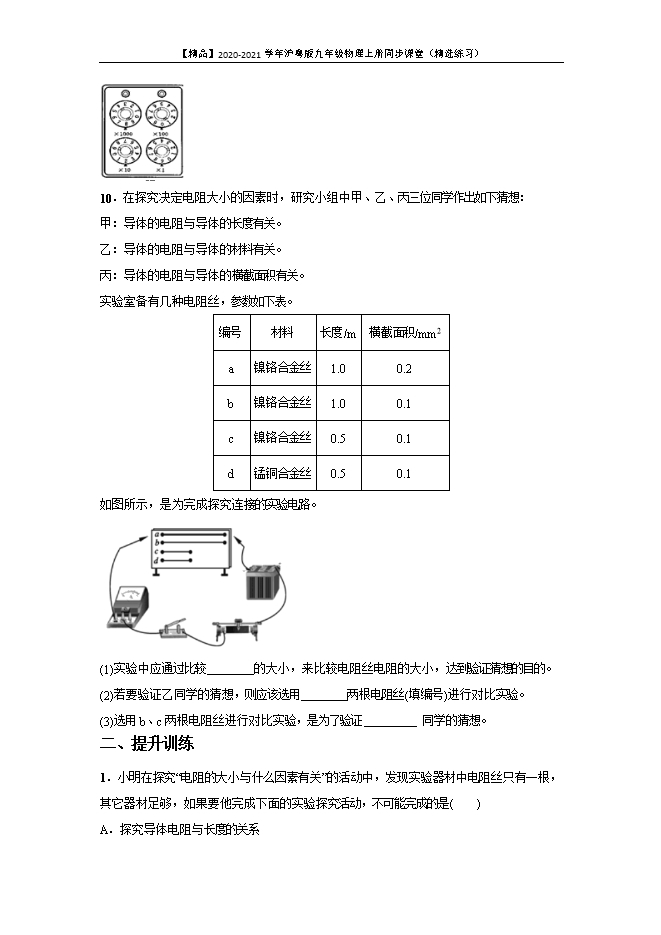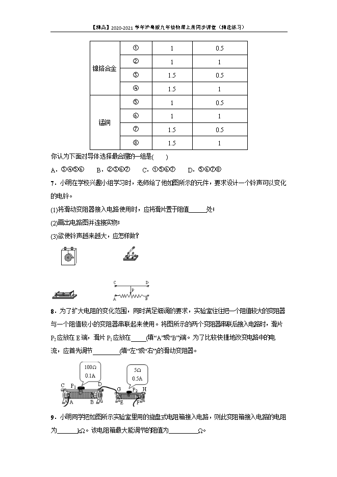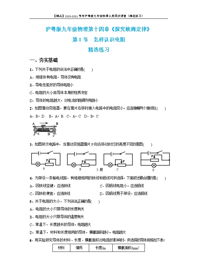 - 1152021-2022沪粤版九年级物理上册期末节节清:14.1 怎样认识电阻(附答案)