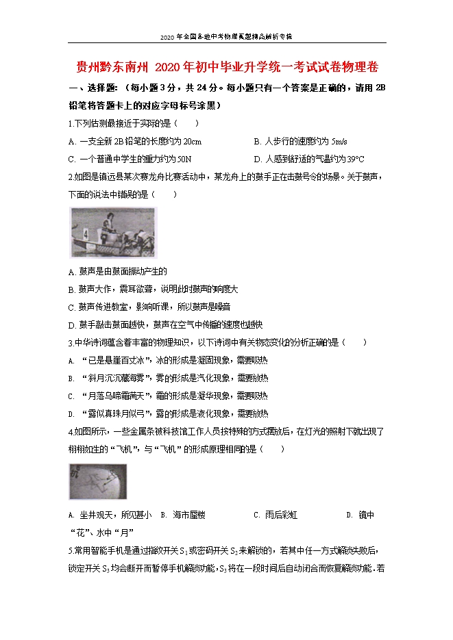 【内容简介】1.下列估测中,最接近实际的是( )A. 一枚鸡蛋的质量约是50gB. 教室内课桌的高度约是1.5mC. 一支新2B铅笔的长度约是40cmD. 一位中学生正常步行的速度约是3m/s【答案】A【解析】【详解】A.10个鸡蛋的质量大约1斤,而1斤=500g所以一个鸡蛋的质量在50g左右,符合题意;B.教室内课桌的高度约是0.8m,不符合题意;C.一支新2B铅笔的长度约是18cm,不符合题意;D.一位中学生正常步行的速度约是1m/s,不符合题意。故选A。2.下列有关声现象的说法中,正确的是( )A. 人们根据音色来辨别长笛和二胡发出的声音B. “隔墙有耳”可以说明真空能够传播声音C. “不在公共场所大声喧哗”是要求人们说话音调要低D. 用超声波除去人体内的结石,说明声波能传递信息【答案】A【解析】【详解】A.不同发声体的材料和结构不同,发出声音的音色不同,人们根据音色来辨别长笛和二胡发出的声音,故A正确;B.“隔墙有耳”可以说明固体能够传播声音,故B错误;C.“不在公共场所大声喧哗”是要求人们说话响度小一些,故C错误;D.用超声波除去人体内的结石,说明声波能传递能量,故D错误。故选A。3.下列有关物态变化现象判断正确的是( )A. 冬天,户外 人呼出“白气”是汽化现象B. 饮料杯中的冰块体积逐渐变小是液化现象C. 冬天教室窗户玻璃上 冰花是凝华现象D. 衣柜中樟脑片过一段时间会变小是熔化现象【答案】C【解析】【详解】A.冬天,户外的人呼出“白气”,是水蒸气遇冷液化形成的小水珠,故A错误;B.饮料杯中的冰块体积逐渐变小,属于熔化现象,故B错误;C.冬天教室窗户玻璃上的冰花,是水蒸气遇冷凝华形成的冰晶,故C正确;D.衣柜中樟脑片过一段时间会变小,属于升华现象,故D错误。故选C。4.下列有关光现象的描述正确的是( )A. “潭清疑水浅”,是由于光的反射形成的B. “云在水中飘”,是由于光的反射形成的C. 海市蜃楼,是由于光的直线传播形成的D. 手影游戏,是由于光的色散形成的【答案】B【解析】【详解】A.“潭清疑水浅”,是光从水中斜射入空气中发生的折射现象,故A错误;B.“云在水中飘”,属于平面镜成像,是由于光的反射形成的,故B正确;C.海市蜃楼,是由于光的折射形成的,故C错误;D.手影游戏,是由于光的直线传播形成的,故D错误。故选B。5.某家庭电路如图所示,下列说法正确的是( ) A. 灯泡两端的电压是36VB. 灯泡L1和L2串联C. 开关S1的位置正确D. 开关S2只控制灯泡L2【答案】D【解析】【详解】A.家庭电路中零线和火线之间的电压是220V,所以灯泡两端的电压是220V,故A错误;B.图中有两条支路,两个灯泡分别在两条支路上,灯泡L1和L2并联,故B错误;C.开关接在火线和用电器之间,图中开关S1接在零线上,它的位置错误,故C错误;D.开关S2和灯泡L2串联,开关S2控制灯泡L2,故D正确。故选D。