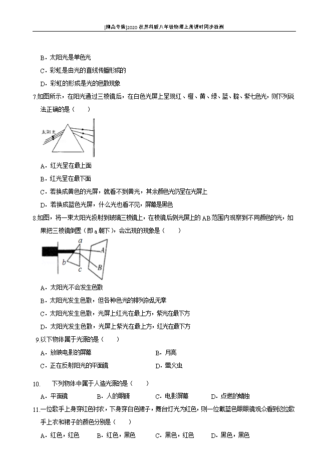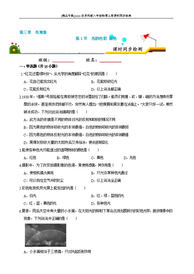 【内容简介】 1.“红花还需绿叶扶”,从光学的角度解释“红花”的原因是( )A.花自己能发出红光B.花能吸收红光C.花能反射红光D.以上说法都正确【答案】C【解答】解:花不是光源,自己不能发出红光;我们平常看到的红花反射的是红光,吸收其他颜色的光,故ABD错误,C正确。故选:C。【知识点】光的反射、物体的颜色 2.1930年,“高斯”号探险船在南极被茫茫的冰雪封住了归路。船员们用撞、砍、锯、砸的方法想弄开厚厚的冰块,甚至用炸药炸都不行,突然有人提出:“把煤屑和黑灰撒在冰面上。”大家只好一试,果然破冰成功,下列对此说法错误的是( )A.此方法的依据是不同的物体对光的反射和吸收的情况不同B.因为黑色的物体吸收光的本领最强,白色的物体吸收光的本领最弱C.因为黑色的物体反射光的本领最强,白色的物体吸收光的本领最强D.黑煤灰吸收大量的太阳热后又传给冰,使冰逐渐熔化【答案】C【解答】解:A、此方法的依据是不同的物体对光的反射和吸收的情况不同,故A正确;不符合题意B、C、因为黑色的物体吸收光的本领最强,白色的物体吸收光的本领最弱,故B正确,不符合题意;C错误;符合题意;D、黑煤灰吸收大量的太阳热后又传给冰,使冰逐渐熔化,故D正确,不符合题意。故选:C。【知识点】物体的颜色 3.能使各种色光均能透过的透明物体的颜色是( )A.红色B.绿色C.黄色D.无色【答案】D【解答】解:无色透明物体能透过所有色光,白色物体能反射所有色光,黑色物体不反射任何色光。有色物体只通过或反射与物体本身颜色相同的色光,如果色光与物体的颜色不相同,则物体看上去呈黑色。故选:D。【知识点】物体的颜色 4.摄影中,为了改变拍摄影像的色调,常使用滤镜,其作用是( )A.使相机镜头美观B.只允许某种色光通过C.可以挡住空气中的灰尘D.以上说法全正确【答案】B【解答】解:滤色镜,会吸收或反射其它的色光,只让某种色光通过,故B正确。故选:B。【知识点】物体的颜色 5.彩色电视机荧光屏上能发出的光是( )A.白光B.红、绿、蓝色的光C.红、蓝、黄色的光D.各种色光【答案】B【解答】解:红、绿、蓝三种单色光按不同的比例混合能合成任意一种色光,所以彩色电视机的荧光屏上丰富多彩的画面是由红、绿、蓝三种单色光合成的。故选:B。【知识点】色光的三原色和颜料的三原色 6.夏季,雨后天空中有大量的小水滴,在太阳光的照射下常会出现如图所示的彩色光带,就该情景中的现象,下列说法中正确的是( ) A.小水滴相当于三棱镜,只对光起反射作用B.太阳光是单色光C.彩虹是由光的直线传播形成的D.彩虹的形成是光的色散现象【答案】D【解答】解:(1)小水滴相当于三棱镜,对光起反射和折射作用,故A错误;(2)雨过天晴时,常在天空出现彩虹,这是太阳光通过悬浮在空气中细小的水珠折射而成的,白光经水珠折射以后,分成各种彩色光,这种现象叫做光的色散现象,所以说雨后的天空出现彩虹是由光的色散形成的。故D正确,BC错误。故选:D。【知识点】光的色散