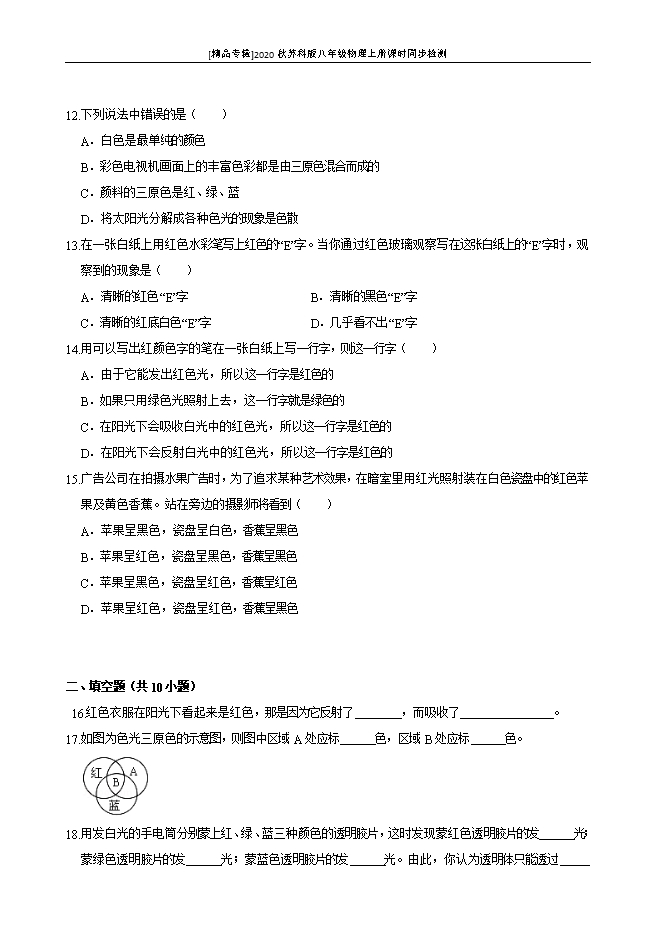 [精品专辑]2020秋苏科版八年级物理上册课时同步检测:3.1 光的色彩 颜色(原卷版和解析版)