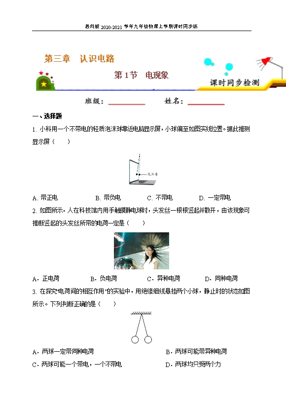 - 2702025-2026学年苏科版物理九年级上册同步练习:第十四章 欧姆定律 随堂小测(附答案)