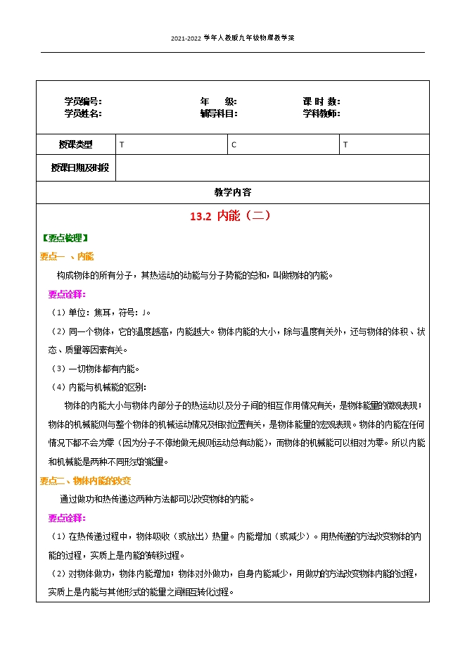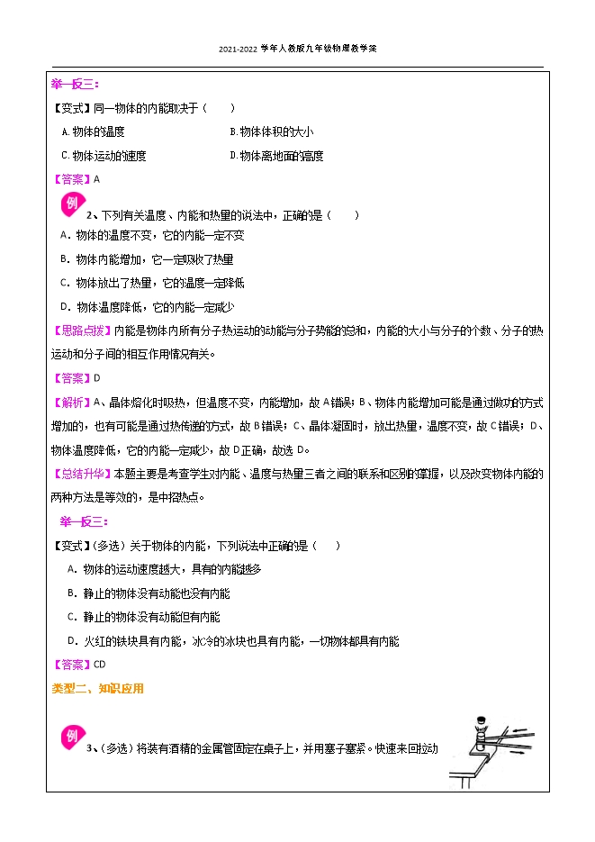 【内容简介】一、方法指导该类题型综合多种物理知识点,紧密联系生活实际,立意于新的物理情景,知识跨度大,综合性强,难度高,解题过程中,应结合题中条件,联系对应的物理模型,选择适当的物理知识分析求解。二、类型解读通常这种类型的分类是根据力、电和热学之间的结合分类,常见的分类有力热综合(如汽车的运动)、电热综合(如电热器)、电力综合(电动车)等,这种分类方式并不能较全面的概括这种类型的综合题,比如题中出现太阳能、潮汐能等能量形式,学生就不知道如何归类。而且这种分类方式也不能具体指导学生如何解答此类综合题,故本书对初中较复杂的这类综合题做如下分类:1、基本公式或基本原理的组合。其中包括力学基本公式和原理、电学基本公式、热学基本公式等在某个实际应用的题干中出现,没有相关的联系。2、能量转化的效率问题。涉及到机械能、电能、热能、太阳能、潮汐能等各种能量相互转化的效率,解题关键是弄清什么能转化成什么能,前者即为总能量,后者为有用的能量,基本的效率公式形式是 或 。只要能根据能量转换写出效率公式,然后将力学、电学或热学基本公式代入即可解题。3、利用图象或表格进行综合。此类问题往往利用图象或者表格数据将力学、电学和热学综合在一起,常常会和电学的动态电路相结合增加试题的难度。学生要能在图象或表格中找到物理量之间的数量关系,并且熟练掌握动态电路分析,才能顺利解决这类问题。 考点一:铭牌类1.(2020•呼伦贝尔)如图甲所示是小明家新购买的电热水壶,他发现水壶有一铭牌如图乙所示。待电热水壶注满水后,他关闭了家中的其他用电器,只让电热水壶工作,观察到家里的电能表(如图丙所示)的转盘1min转了50圈,能使壶中水的温度从25℃升高到35℃.请你结合电热水壶上的铭牌和电能表实物图提供的有关参数信息,忽略温度对电阻的影响。求: (1)电热水壶正常工作的电阻;(2)电热水壶中水的温度从25℃升高到35℃吸收的热量;[c水=4.2×103J/(kg•℃)](3)此时电路的实际电压。【解析】解:(1)由P= 得电热水壶正常工作的电阻:R= = =40Ω;(2)水的体积V=1L=1×10﹣3m3,由ρ= 得水的质量:m=ρV=1×103kg/m3×1×10﹣3m3=1kg,水从25℃升高到35℃吸收的热量:Q吸=cm(t﹣t0)=4.2×103J/(kg•℃)×1kg×(35℃﹣25℃)=4.2×104J;(3)3000r/(kW•h)表示每消耗1kW•h的电能,电能表的转盘转3000r,