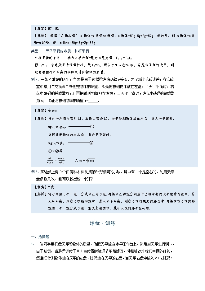 【内容简介】知识• 解读1.定义:由于地球的吸引而使物体受到的力.2.大小:G=mg,g=9.8N/Kg,粗略计算时取10N/Kg.3.方向:竖直向下.4.作用点——重心(1)重心:一个物体的各部分都受到重力的作用,从效果上看,我们可以认为各部分受到的重力作用集中于一点,这一点叫做物体的重心.(2)决定因素:质量分布均匀的物体的重心只跟物体的形状有关,质量分布不均匀的物体,重心除跟物体的形状有关外,还跟物体的质量分布情况有关.(3)确定方法:对形状不规则的薄物体,可以采用悬挂法来确定重心的位置.典例• 解读例1、关于重力和重心,下列说法正确的是( )A.当物体漂浮在水面上时重力会减小B.放置在水平面上的物体对水平面的压力就是物体的重力C.物体的重心位置总是在物体的几何中心上D.物体的重心位置可能随物体形状的变化而改变 培优• 训练1、下列关于重心的说法中正确的是( )A.任何有规则形状的物体,它的重心一定与它的几何中心重合B.用一条绳子把一个物体悬挂起来,物体处于完全静止状态,该物体的重心不一定在绳子的延长线上C.任何物体的重心都在物体内,不可能在物体外D.重心与物体的形状和物体的质量分布有关2、如图所示,歼20战机是中国最近研制出的第五代隐身重型歼击机.它以具有隐身性、高机动性以及先进的航电系统让世界震惊.关于歼20战机的受力,下列说法正确的是( ) A.战机受到的重力指向地心 B.战机受重力的同时,它也对地球产生引力 C.战机向前运动的推力无施力物体 D.战机匀速飞行,它不受重力作用3、一人站在体重计上称体重,保持立正姿势时称得体重为G,当其缓慢地将一条腿平直伸出台面,体重计指针稳定后读数为G′,则( )A.G;G′ B.G;G′ C.G=G′ D.无法判断4、下列说法正确的是( )A.自由下落的石块速度越来越大,说明石块所受重力越来越大B.在空中飞行的物体不受重力作用C.一抛出的石块轨迹是曲线,说明石块所受的重力方向始终在改变D.将一石块竖直向上抛出,在先上升后下降的整个过程中,石块所受重力的大小与方向都不变5、(多选)一个物体所受的重力在下列情形下要发生变化的有( )