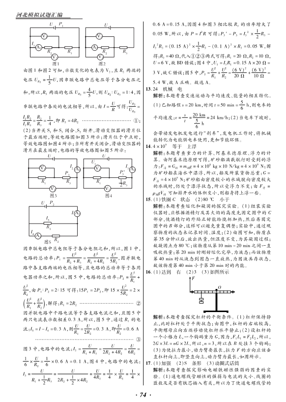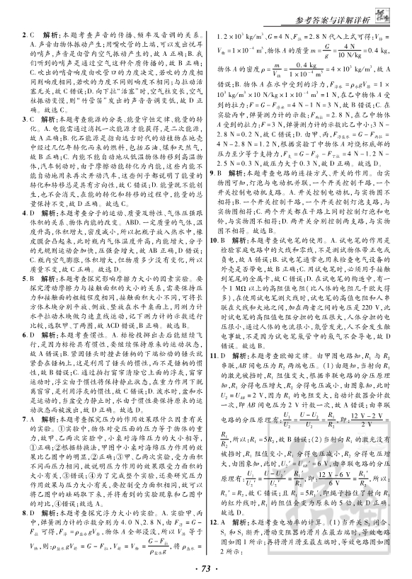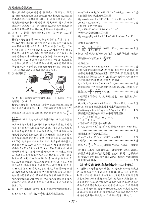 【内容简介】一、填空题。(共6 小题,每空1分,共 14分)1.电风扇静止吊在天花板上,此时该电风扇受到_______个力作用,当剪断吊绳,一切外力消失时, 电风扇将处于_________状态。2.如图 1所示是皮划艇比赛时的画面,队员手中的船桨是_________杠杆;用船桨向后划水,船向前行驶,说明物体间力的作用是________的;皮划艇加速冲向终点时,动能变________(填"大""或"小")。3.自行车是人们常用的交通工具,其中包含许多物理知识,①轮胎上有凸凹不平的花纹是为了___________;②坐垫呈马鞍形是为了___________;③当人骑自行车前进时,停止蹬自行车后,自行车仍然向前走,是由于它具有_________。4.一艘轮船从海里驶往江里,轮船受到的浮力将_________,船排开水的体积将_________。(两空均选填"变大"、"变小"或"不变",ρ海水>ρ江水) 图1 图25.钓鱼是许多人喜爱的一种休闲活动,如图2 所示。当有鱼上钩时,鱼竿会被拉弯,说明力能改变物体的________。如钓鱼者将一条重为4 N的鱼从水面提高2 m,再沿水平方向移 3 m,在这一过程中,钓鱼者克服鱼的重力做功为_________J。6.通常情况下,许多物质的凝固点、密度、沸点等都是稳定不变的。这些稳定不变的物理量既是物质的基本属性,也是自然界平衡与和谐的本质反映。假如这些物理量发生改变,我们生产,生活中的许多现象就会发生变化。请仿照示例,就任一物理量发生改变,提出一个相关的物理问题,并做出合理的猜想。【示例】问题:如果水的密度变小,,轮船的吃水深度将如何变化?猜想:轮船的吃水深度将增加。问题:__________________________________猜想:__________________________________二、选择题(每题2 分,共 16 分。第 7—12 题每题只有一个选项符合题目要求,第13—14题每题有两个选项符合题目要求,全部选对的得2分,只选一个且正确的得1分,有错选的得0分。) 7.在下列数据中,最接近生活实际的是( )A.初中生 100 m 赛跑的时间约为 1min B.托起两个鸡蛋所用的力大约是 10N C.一个中学生体重约为 500N D.一次性医用口罩的质量约为 5kg ......