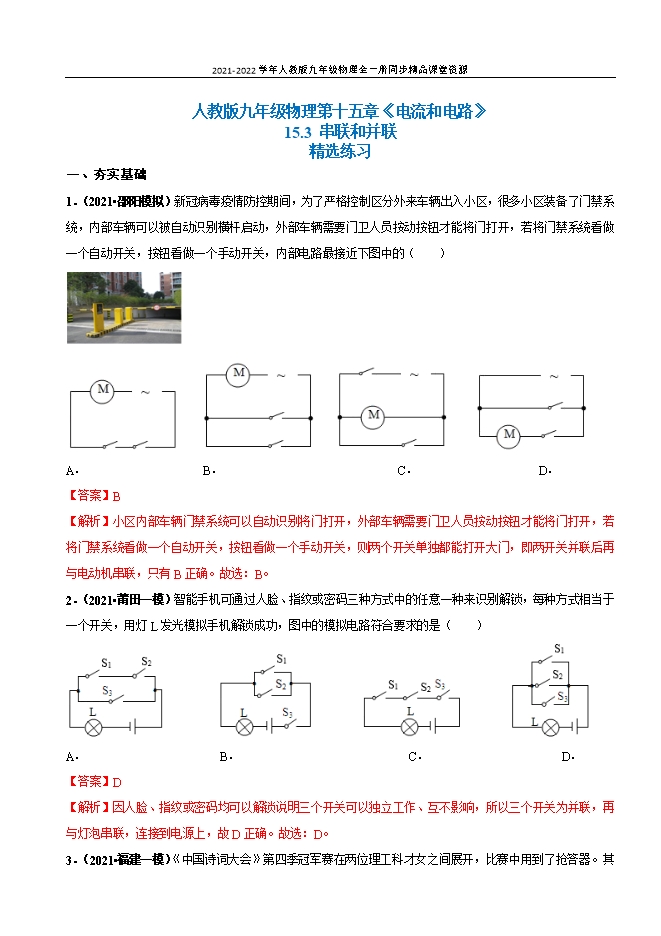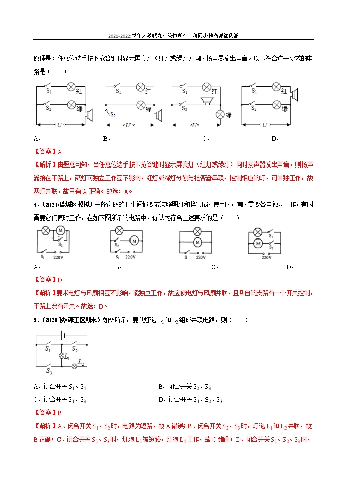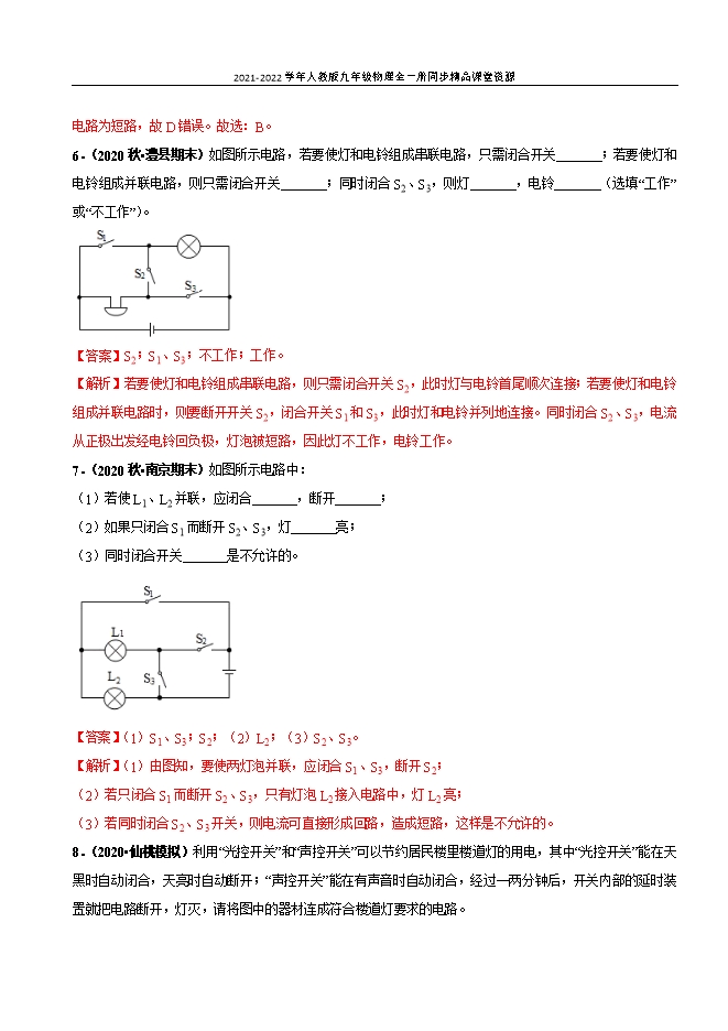 【内容简介】自动售票公交车后门两侧的扶手上各装有一个红色按钮,如图所示;想要下车的乘客只要按下其中任何一个按钮,装在车内的电铃就会响起,以提醒司机停车并打开车门。在如图所示的四个电路中符合设计要求的是( )【答案】D【解析】A.开关S1与电铃串联后与开关S2并联,当开关S2闭合后,会形成电源短路,故A不符合题意;B.开关S1为总开关,开关S2与电铃并联,因此只闭合开关S2时,电铃不响,故B不符合题意;C.两个开关串联,即两个开关必须同时闭合电铃才能发声,故C不符合题意;D.两个开关并联后共同控制电铃,即任何一个开关闭合后,电铃都能发声,故D符合题意。故选:D。2.(2021•科尔沁区模拟)居民楼的楼道里,夜间只是偶尔有人经过,电灯总是亮着造成很大浪费。科研人员利用“光敏”材料制成“光控开关”﹣﹣天黑时,自动闭合,天亮时,自动断开;利用“声敏”材料制成“声控开关”﹣﹣当有人走动发出声音时,自动闭合,无人走动时自动断开。若将这两种开关配合使用,就可以使楼道灯变得“智能化”。则这种“智能化”的电路是图中的( ) A. B. C. D.【答案】D【解析】根据题意可得,声控开关和光控开关串联后共同控制灯泡,即用导线将各元件依次连接起来。故选:D。3.(2021•望花区三模)为了提高行车的安全性,汽车安装了日间行车灯。当汽车启动时,S1闭合,日间行车灯L1亮起;光线不足时再闭合S2,车前大灯L2也亮起。则图乙所示的电路图中符合上述要求的是( ) A. B.C. D.【答案】D【解析】A.由电路图可知,只闭合S1时,两灯泡均不亮,故A不符合题意;B.由电路图可知,只闭合S1时,灯L2亮,再闭合S2时,灯L1亮,故B不符合题;C.由电路图可知,只闭合S1时,两灯泡都亮,再闭合S2时,L1被短路不亮,故C不符合题意;D.由电路图可知,只闭合S1时,灯L1亮,再闭合S2时,灯L2亮,故D符合题意意。故选:D。4.(2021•马山一模)火车某节车厢有两间洗手间,只有当两间洗手间的门都关上时(每扇门的插销都相当于一个开关),车厢中指示牌内的指示灯才会发光提示旅客“洗手间有人”。能实现上述设计的电路图是图中的( ) A. B. C. D.【答案】C【解析】A、由电路图可知,闭合任意一个开关,灯泡都发光,故A不合题意;B、由电路图可知,闭合S2时指示灯亮,再闭合S1时指示灯不亮,且会发生电源短路。故B不合题意;C、由电路图可知,只有两开关都闭合时灯泡发光,故C符合题意;D、闭合S1时指示灯亮,再闭合S2时指示灯不亮,且会发生电源短路。故D不合题意。故选:C。5.(2021•安徽一模)如图所示,为保证驾驶员的安全,轿车上设有安全带提示系统。当驾驶员坐在座椅上时,座椅下的电键S1闭合、电键S2断开,指示灯L亮起;当驾驶员系上安全带时,电键S2闭合,指示灯L熄灭,在如图所示的各电路中,符合上述要求的是( ) A. B.C. D.【答案】B【解析】A、两开关串联,只有乘客坐下,系上安全带时指示灯才会发光,不符合题意,故A错误;B、指示灯与S1串联,与S2并联,乘客坐下时指示灯亮,系上安全带时,指示灯被短路熄灭,并且不会出现电源短路,符合题意,故B正确;C、指示灯与S1串联,与S2并联,乘客坐下时指示灯亮,系上安全带时,指示灯被短路熄灭,但出现电源短路,故C错误;D、两开关并联,无论乘客坐下,还是系上安全带,指示灯都会发光,不符合题意,故D错误。故选:B。6.(2020秋•金牛区期末)如图所示的电路,下列说法不正确的是( ) A.若开关S1、S3断开,S2闭合,则两灯串联B.若开关S1、S3闭合,S2断开,则两灯并联C.当三个开关都闭合时,只有灯L2发光D.若开关S1、S2闭合,S3断开,只有灯L2发光【答案】D【解析】A、若开关S1、S3断开,S2闭合,灯L1、L2首尾顺次连接,则两灯串联,故A正确;B、若开关S1、S3闭合,S2断开,L1、L2首首相连、尾尾相连,则两灯并联,故B正确;C、当三个开关都闭合时,电流不经过用电器直接回到电源的负极,形成短路,故C错误;D、若开关S1、S2闭合,S3断开,灯L1被短路,只有灯L2发光,故D正确。故选:C。7.(2021•三水区一模)如图所示的电路中,要使灯泡L1和灯泡L2组成串联电路,应将开关S1断开,开关S2闭合,开关S3 ;要使灯泡L1和灯泡L2组成并联电路,应将开关S1闭合,开关S2断开,开关S3 ;如果将开关S1断开,开关S2和开关S3都闭合,则只有一个灯泡发光,发光的灯泡是 。
