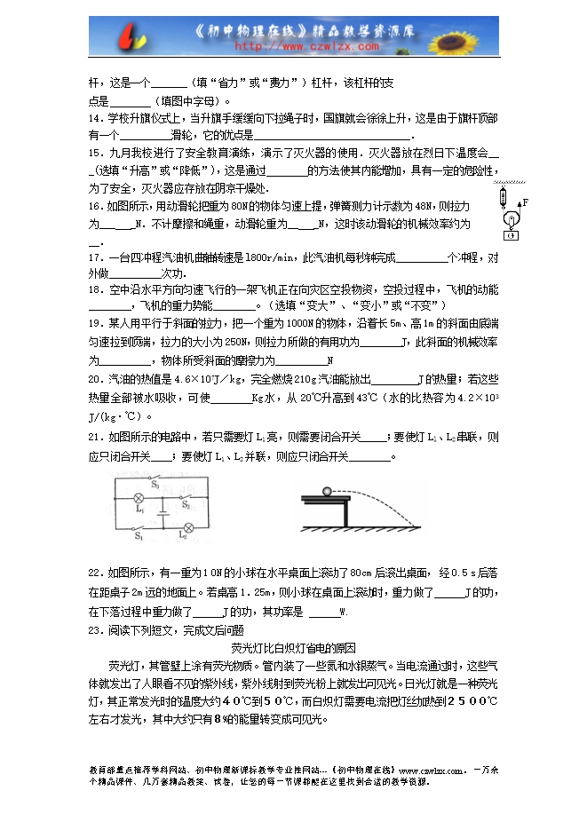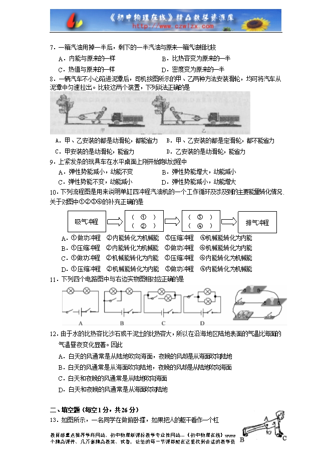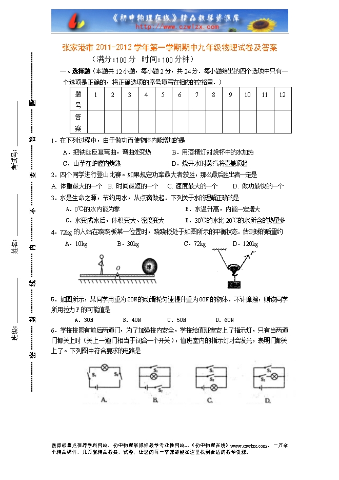 2010-2011学年第一学期泰兴市实验初级中学初三10月月考物理试卷及答案