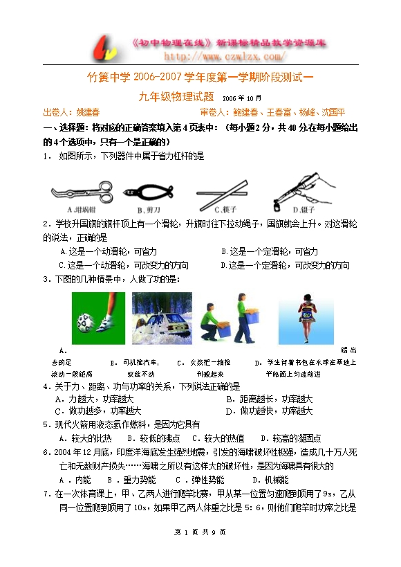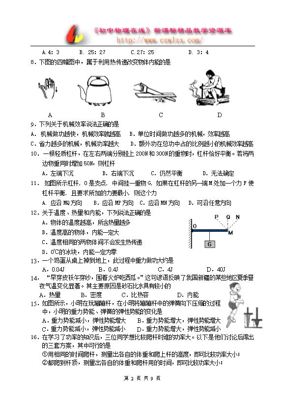 【内容简介】1.(1)如图甲所示,所测物体的长度是 cm。(2)如图乙所示,弹簧测力计的示数为 N。(第 1 题图)(第 2 题图)(第 4 题图)2.如图所示为 2022 年 1 月 26 日航天员叶光富在空间站用葫芦丝演奏《月光下的凤尾竹》的情景。“葫芦丝”是靠空气柱 发声的;按不同的孔,可以改变声音的 。3.甲、乙两实心金属块,它们的体积之比为 2:1,将它们分别放在调好的天平的左右盘中,天平恰好平衡,甲和乙的质量之比为 ;若将甲切去,乙切去,那么甲和乙剩余部分的密度之比是 。4.如图所示,三条互相平行的光线入射到凹凸不平的物体表面上,三条反射光线 (选填“会”或“不会”)平行射出,这种反射 (选填“遵循”或“不遵循”)光的反射定律。(第 5 题图) (第 6 题图)(第 7 题图)5. 2020 年 12 月 17 日凌晨,嫦娥五号月球探测器带着“月球土特产”安全着陆。嫦娥五号探测器由上升器,着陆器、返回器和轨道器四部分组成。着陆器和上升器的组合体降落至月 球表面后完成月球采样,并将携带的国旗在月面展开,最终,独自携带 1731g 月球样品的返回器先以高速进入地球大气层,然后借助大气层提供的升力“打水漂”后跳起来,之后再重新进入大气层才安全返回地 面(如图)(1)国旗上的五角星呈现黄色是因为五角星只 (选填“反射”或“吸收”)黄光。(2)返回器加速下降的过程中,借助大气层提供的升力“打水漂”,说明力可以改变物体的 ;安全返回的返回器将地面砸出个大坑,说明力可以改变物体的 。(3)1731g 月球样品到达地球后,质量变为 kg6.如图所示,某同学手握矿泉水瓶不动,矿泉水瓶受到的摩擦力方向是的;他将矿泉水喝去一部分,继续握在手里,则瓶子受到的摩擦力将 (选填“变大”“变小”或“不变”)。7.如图所示,弹簧测力计和细线的重力及一切摩擦均不计,物重 G=5N,则弹簧测力计 A 的示数为 N,弹簧测力计 B 的示数为 N。二、选择题(每题 2 分,共 16 分,为双选题)8.下列对中学生体育运动相关数据的估测,符合实际的是()。A. 立定跳远的距离约为 2mB. 一个实心球的质量约为 30kgC. 跑步的速度约为 60m/sD. 50 米跑的满分成绩约为 6min 9.如图所示的声现象中,分析正确的是()