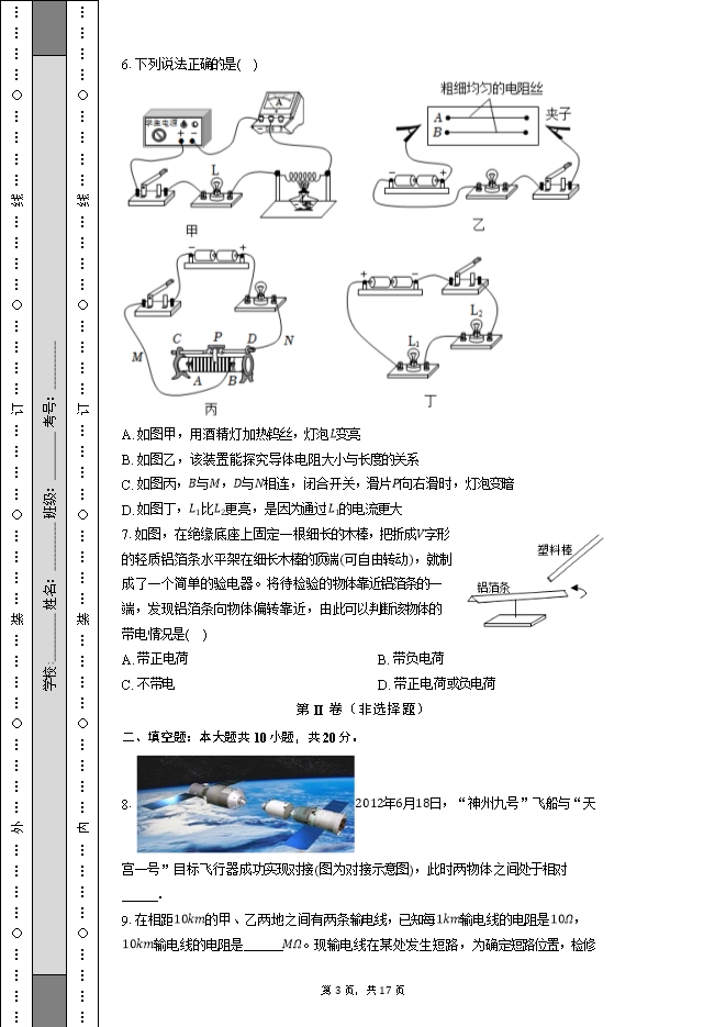【内容简介】1.下列现象中没有利用“水的比热容大”这一特点的实例是( ) A. 甲图,冬天的暖气设备用热水供暖B. 乙图,汽车发动机用水来冷却C. 丙图,早春傍晚,农民向稻田里灌水保护秧苗D. 丁图,深秋夜晚,果农给树上喷水结冰防冻坏桔子2.现在很多家庭都配备了智能扫地机器人,其避障功能利用了类似凸透镜成像的原理。扫地机器人顶部的传感器相当于凸透镜,当有障碍物靠近时,传感器能感知到物体并避开。若该传感器的焦距为5cm,某次它检测到一个距离它8cm的障碍物,以下说法正确的是( )A. 此时传感器成倒立、缩小的实像,像距在5cm到10cm之间B. 此时传感器成倒立、放大的实像,像距大于10cmC. 此时传感器成正立、放大的虚像,像距大于8cmD. 此时传感器成倒立、等大的实像,像距等于10cm3.如图所示,“GMR”是巨磁电阻,它的阻值随磁场的增强而变小。当闭合开关S_1和S_2,滑动变阻器的滑片向左移动时,下列说法中正确的是( )A. 电压表V_1与电压表V_2之和不变B. 电磁铁的右端为N极C. 电压表V_2与电流表A的比值不变D. 电压表V_1与电流表A的比值变大4.下列关于光现象的说法中错误的是( )A. 我们能从不同方向看到物体,就是因为光发生了漫反射B. 教室黑板发生了“反光”现象,是因为黑板表面发生了镜面反射C. 漫反射光线杂乱无章,不遵循光的反射定律D. 城市“光污染”现象,主要是由于建筑物表面装饰发生了镜面反射5.物理学习小组研究电路的特点,一组同学按照甲电路图连接好电路后,闭合开关,电路正常工作,学生电压表V_1和V_2的指针偏转均如图乙所示;二组同学按照丙电路图连接电路。已知R_1=4Ω,两小组所用的电源和定值电阻均相同,下列判断正确的是( )