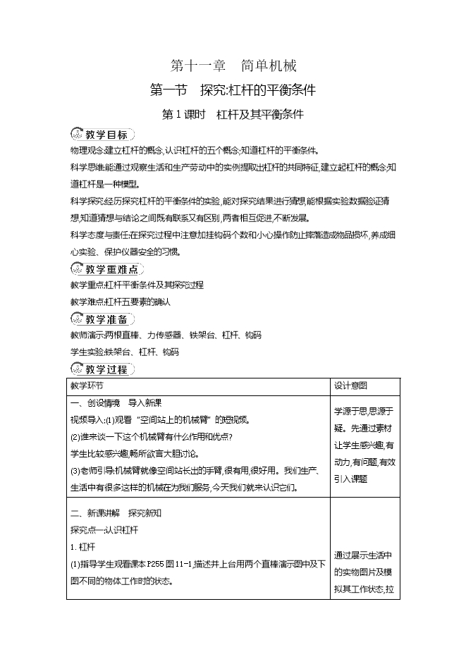 【内容简介】物理观念:建立杠杆的概念,认识杠杆的五个概念;知道杠杆的平衡条件。科学思维:能通过观察生活和生产劳动中的实例提取出杠杆的共同特征,建立起杠杆的概念;知道杠杆是一种模型。科学探究:经历探究杠杆的平衡条件的实验,能对探究结果进行猜想,能根据实验数据验证猜想,知道猜想与结论之间既有联系又有区别,两者相互促进,不断发展。科学态度与责任:在探究过程中注意加挂钩码个数和小心操作防止摔落造成物品损坏,养成细心实验、保护仪器安全的习惯。 教学重点:杠杆平衡条件及其探究过程教学难点:杠杆五要素的确认 教师演示:两根直棒、力传感器、铁架台、杠杆、钩码学生实验:铁架台、杠杆、钩码 教学环节 设计意图一、创设情境 导入新课视频导入:(1)观看“空间站上的机械臂”的短视频。(2)谁来谈一下这个机械臂有什么作用和优点?学生比较感兴趣,畅所欲言大胆讨论。(3)老师引导:机械臂就像空间站长出的手臂,很有用,很好用。我们生产、生活中有很多这样的机械在为我们服务,今天我们就来认识它们。 学源于思,思源于疑。先通过素材让学生感兴趣,有动力,有问题,有效引入课题二、新课讲解 探究新知探究点一:认识杠杆1.杠杆(1)指导学生观看课本P255图11-1,描述并上台用两个直棒演示图中及下图不同的物体工作时的状态。 铡刀 跷跷板 羊角锤 撬棒 (2)教师引导,学生思考:仔细观察以上物体以及同学们进行的演示,小组讨论总结这些物品的特征。提示:这些物品都围绕着一个点在转动。教师引导,学生归纳:在力的作用下绕一个固定点转动的硬棒称为杠杆。2.杠杆的五要素(1)老师指导学生阅读课本P255“认识杠杆”部分,回答下列问题。①支点(O):杠杆绕着转动的固定点;②动力(F1):使杠杆转动的力;③阻力(F2):阻碍杠杆转动的力;④动力臂(l1):从 支点 到 动力作用线 的距离; ⑤阻力臂(l2):从 支点 到 阻力作用线 的距离。 通过展示生活中的实物图片及模拟其工作状态,拉近物理与学生的距离先看书了解,再尝试明确,再听老师点拨,最后尝试应用,由易到难,步步深入