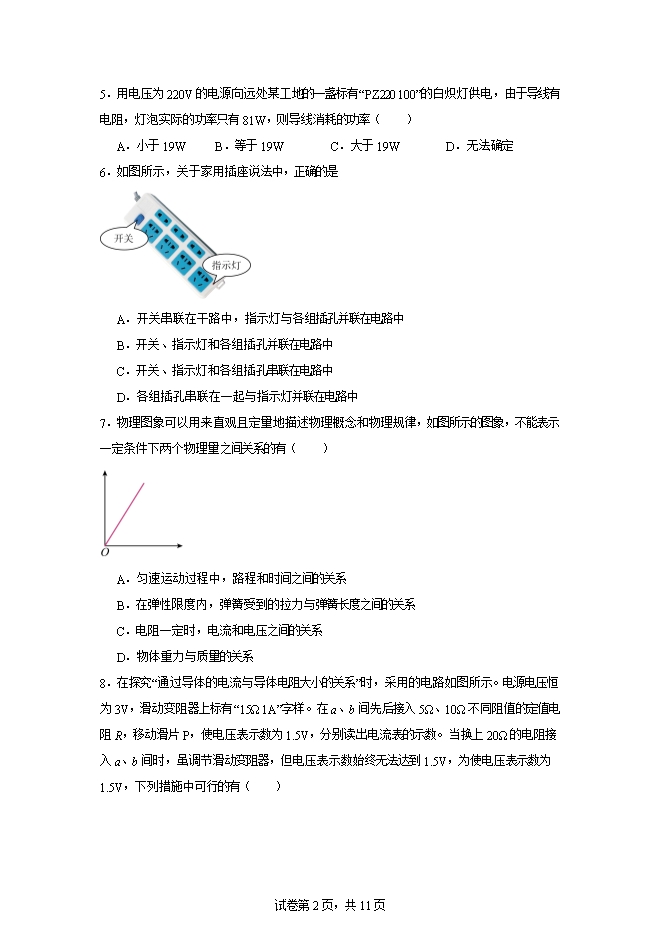 【内容简介】1.“珍爱生命、注意安全”是我们日常生活中必须具有的意识。下列做法中,符合安全用电原则的是( )A.使用正在充电的手机打电话B.不接地使用三角插头的用电器C.发现有人触电要迅速用手把他拉开D.外壳破损的用电器要及时维修或更换2.如图所示的电路,电源电压恒定,当开关S闭合时( ) A.电流表示数变小,电压表示数变大 B.电流表示数变大,电压表示数不变C.电流表示数不变,电压表示数变小 D.电流表示数不变,电压表示数变大3.下列关于电功、电功率的一些说法中正确的是( )A.用电器消耗的功率越大,则电流做功越快B.用电器消耗的电功率越小,则电流做的功就越少C.千瓦和千瓦时都是电功率的单位D.通过用电器的电流做功越多,则用电器功率就越大4.我国天问一号火星探测器通过一次任务完成火星环绕、着陆和巡视三大目标,标志着我国在行星探测领域跨入了世界先进行列。天问一号在环绕火星运行过程中,下列说法正确的是( )A.天问一号相对火星做匀速直线运动B.天问一号相对火星处于静止状态C.天问一号通过声波将信息传回地球D.天问一号通过电磁波将信息传回地球5.用电压为220V的电源向远处某工地的一盏标有“PZ220 100”的白炽灯供电,由于导线有电阻,灯泡实际的功率只有81W,则导线消耗的功率( )A.小于19W B.等于19W C.大于19W D.无法确定6.如图所示,关于家用插座说法中,正确的是