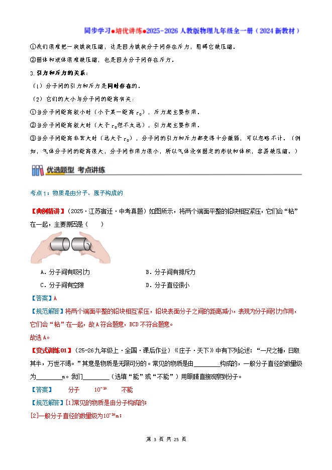 【内容简介】知识点梳理01: 物质是由大量分子构成的1.分子的概念: 我们身边的所有物质,如空气、水、石头、金属等,都是由极其微小的粒子构成的,这些粒子就是分子。(电子显微镜下的金原子) 2.分子很小: 分子的体积非常小,通常以10⁻¹⁰米(纳米级别,1纳米=10⁻⁹米)为单位来度量。(1)例如:一个水分子的直径大约是4×10⁻¹⁰米。如果把分子设想成球形,那么将亿万个分子紧密排列起来,也只有针尖那么大的一点。(2)分子的质量也非常小,例如,一个水分子的质量大约是3×10⁻²⁶千克。3.分子数量巨大: 任何宏观物体中都含有大量的分子。(1)例如,1cm³的水中大约含有3.35×10²²个水分子。如果一个人每秒数10个分子,日夜不停地数,数完这些水分子大约需要100亿年!知识点梳理02: 一切物质的分子都在不停地做无规则运动1.扩散现象——分子运动的证据:(1)定义: 不同的物质在互相接触时,彼此进入对方的现象,叫做扩散。(2)举例:①气体扩散: 打开香水瓶盖,过一会儿整个房间都能闻到香味。这是香水分子扩散到空气中。②液体扩散: 在一杯清水中滴入一滴红墨水,过一会儿整杯水都变红了。这是墨水分子扩散到水分子