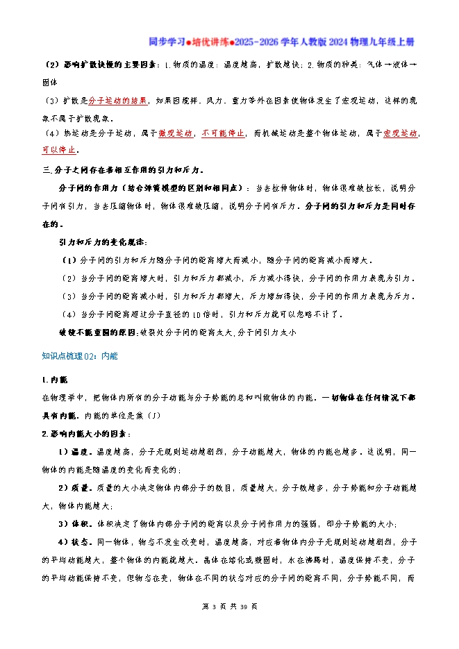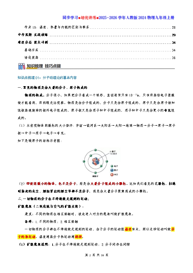【内容简介】知识点梳理01:分子动理论的基本内容一.常见的物质是由大量的分子、原子构成的物质的构成。分子很小,如果把分子看成一个球形,直径通常只有10-10m,只有用高倍电子显微镜才能看到,用肉眼无法观察。物质是由分子组成的,分子又是由原子组成的,原子又是由 原子核和绕核高速旋转的核外电子组成的,原子核又是由质子和中子组成的,质子和中子又是由更小的夸克组成的。(1)从宏观物体到微粒的大小排序:宇宙→银河系→太阳系→太阳→地球→物质→分子→原子→原子核→中子→质子→电子→夸克。如下是碳原子的结构示意图: (2)即使很微小的物体,也不是分子,而是由大量分子组成的小颗粒。比如我们看见的花粉粒、扫地时扬起的灰尘、烟囱冒出的烟尘等都不是分子,而是由大量分子聚集而成的小颗粒。二.一切物质的分子在不停地做无规则的运动;扩散现象(二氧化氮与空气的扩散实验):定义:不同的物质在相互接触时,彼此进入对方的现象叫做扩散现象。条件:1.不同的物质;2.相互接触一切物质的分子都在不停地做无规则的运动,由于分子的运动跟温度有关,所以这种运动叫做分子的热运动。温度越高分子热运动越剧烈。(1)扩散现象说明:1.分子在不停地做无规则运动;2.分子间存在间隙(2)影响扩散快慢的主要因素:1.物质的温度:温度越高,扩散越快;2.物质的种类:气体→液体→固体(3)扩散是分子运动的结果,如果因搅拌、风力、重力等外在因素使物体发生了宏观运动,这样的现象不属于扩散现象。(4)热运动是分子运动,属于微观运动,不可能停止,而机械运动是整个物体运动,属于宏观运动,可以停止。三.分子之间存在着相互作用的引力和斥力。分子间的作用力(结合弹簧模型的区别和相同点):当去拉伸物体时,物体很难被拉长,说明分子间有引力,当去压缩物体时,物体很难被压缩,说明分子间有斥力。分子间的引力和斥力是同时存在的。引力和斥力的变化规律:(1)分子间的引力和斥力随分子间的距离增大而减小,随分子间的距离减小而增大。(2)当分子间的距离增大时,引力和斥力都减小,斥力减小得快,分子间的作用力表现为引力。(3)当分子间的距离减小时,引力和斥力都增大,斥力增加得快,分子间的作用力表现为斥力。(4)当分子间距离超过分子直径的10倍时,引力和斥力就可以忽略不计了。破镜不能重圆的原因:破裂处分子间的距离太大,分于间引力太小知识点梳理02:内能