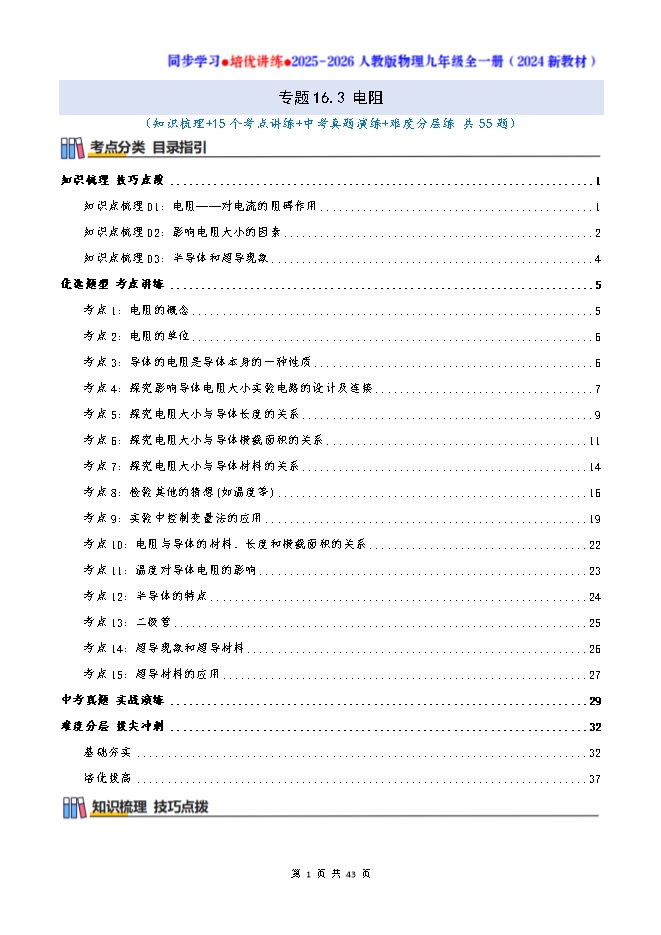 专题16.3 电阻--2025-2026人教版物理九年级全一册同步学习 培优讲练:知识梳理+考点讲练+中考真题演练+难度分层(试题版和答案版)