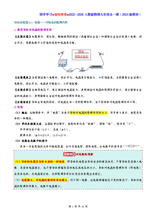【内容简介】知识点梳理01:电阻——对电流的阻碍作用1.探究导体对电流的阻碍作用【实验过程】如图所示,把长短、粗细相同的铜丝(或锰铜合金丝)和镍铬合金丝分别接入电路,闭合开关,观察电路中小灯泡的亮度和电流表示数。 【实验现象】当把铜丝接入电路时,闭合开关,电流表示数较大,小灯泡较亮;当把镍铬合金丝接入电路时,闭合开关,电流表示数较小,小灯泡较暗。【实验分析】在相同电压下,通过铜丝的电流较大,表明铜丝对电流的阻碍作用较小;通过镍铬合金丝的电流较小,表明镍铬合金丝对电流的阻碍作用较大。【实验结论】导体在导电的同时,对电流也有一定的阻碍作用,且不同导体对电流阻碍作用不同。2.电阻(1)概念:在物理学中,用“电阻”来表示导体对电流的阻碍作用的大小。用字母R表示,电阻是导体的一种属性。(2)单位及换算关系:在国际单位制中,电阻的单位是“欧姆”,简称“欧”,符号是“Ω”。常用单位有千欧(kΩ)、兆欧(MΩ)。换算关系:1MΩ=103kΩ,1kΩ=103Ω。(3)电阻在电路中的符号具有一定电阻值的元件叫做电阻器,也叫定值电阻,简称电阻。在电路中的符号