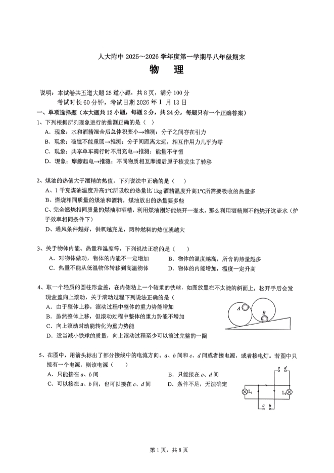 北京市人大附中2025-2026学年八年级上学期期末物理试卷(pdf版无答案)