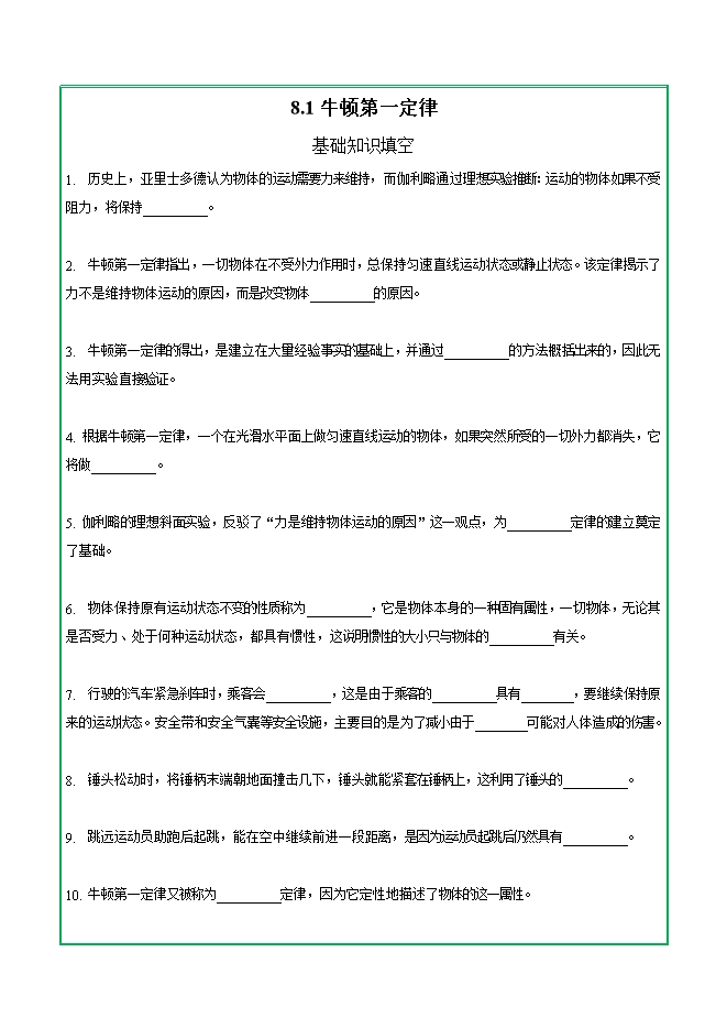 【内容简介】第八章 第一节 牛顿第一定律—2025-2026学年人教版物理八年级下学期预习基础知识填空(附答案)