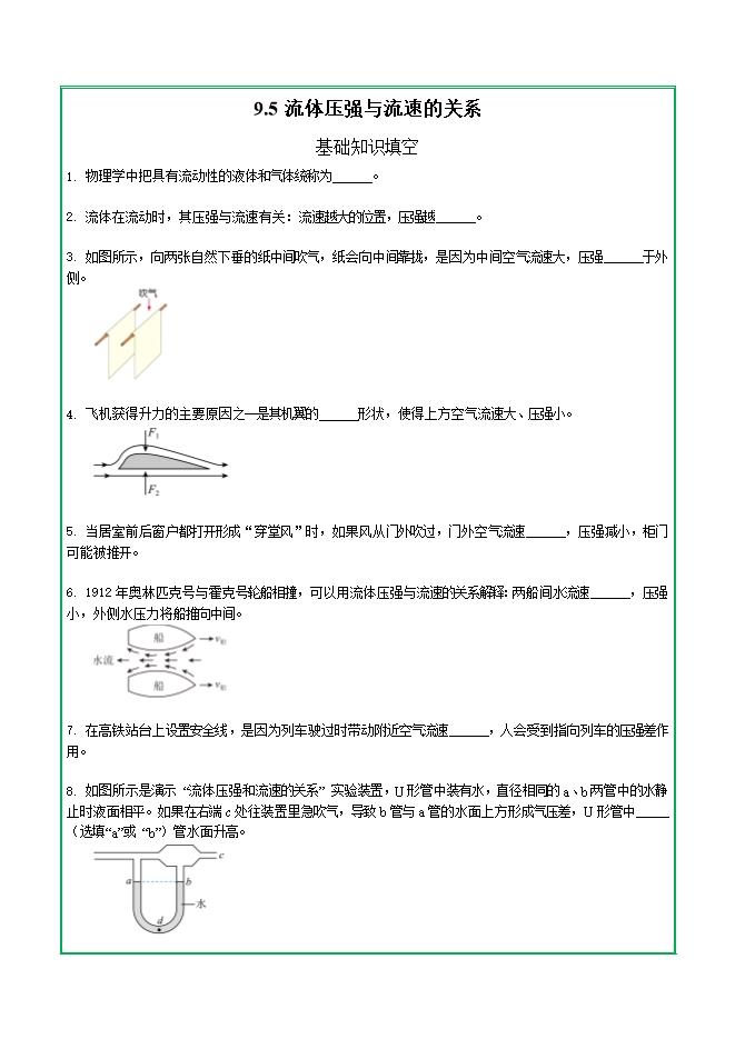 第九章 第五节 流体压强与流速的关系—2025-2026学年人教版物理八年级下学期预习基础知识填空(附答案)