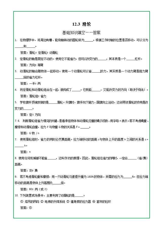 【内容简介】第十二章 第三节 滑轮—2025-2026学年人教版物理八年级下学期预习基础知识填空(附答案)