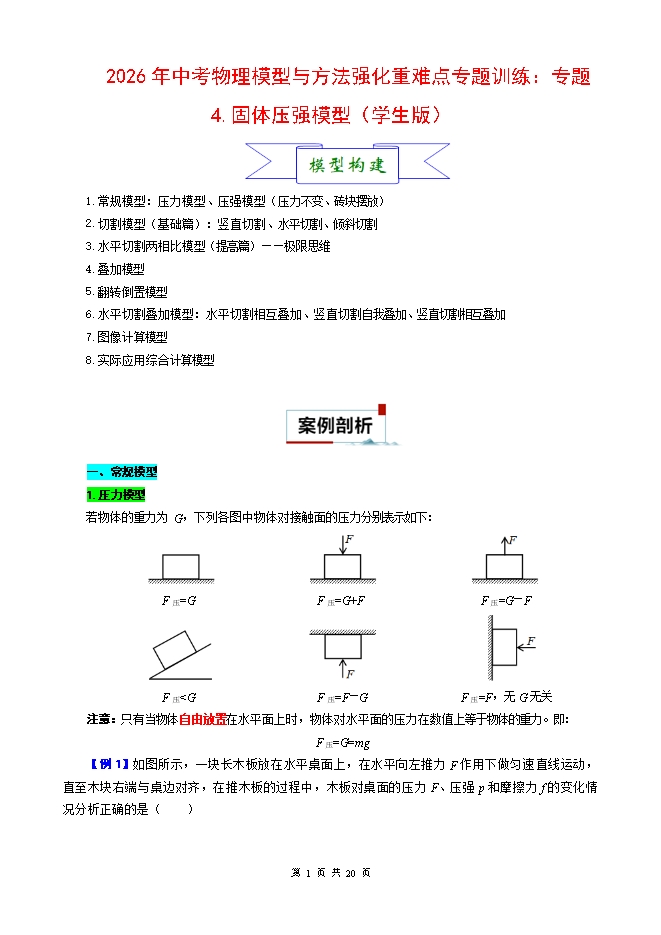 【内容简介】2026年中考物理模型与方法强化重难点专题训练:专题4.固体压强模型(学生版和教师版)