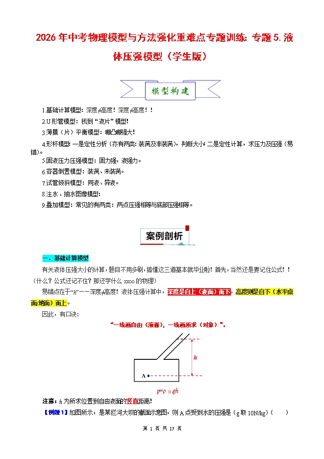 【内容简介】2026年中考物理模型与方法强化重难点专题训练:专题5.液体压强模型(学生版和教师版)
