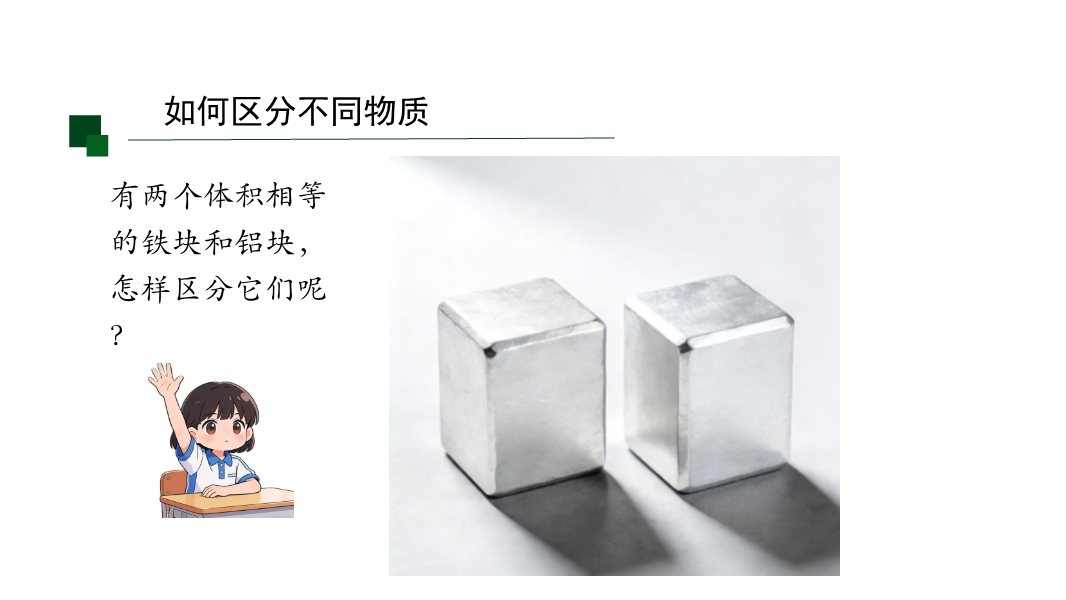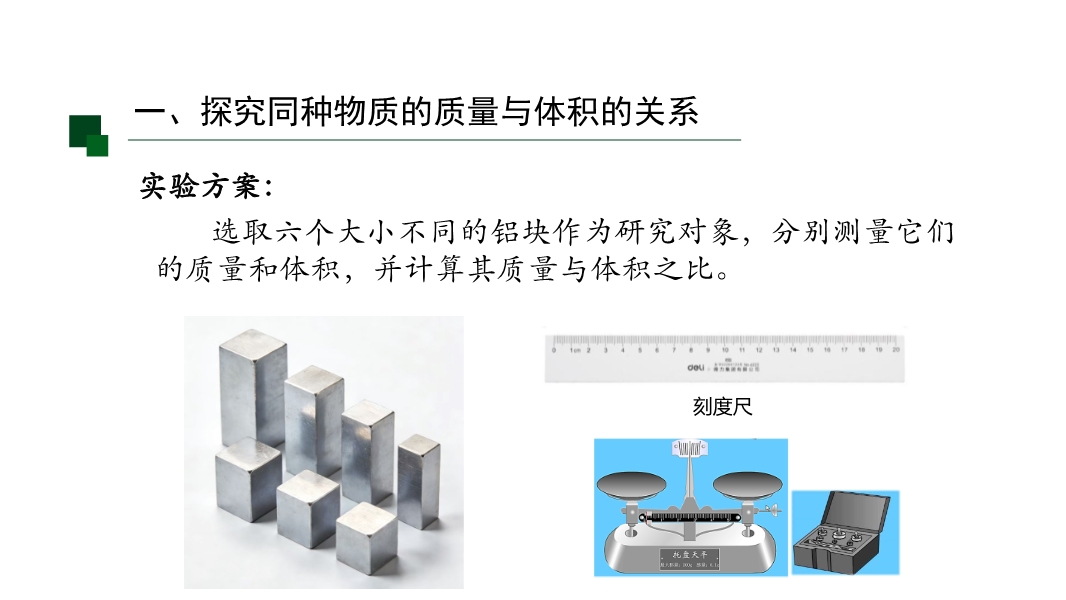 【内容简介】该初中物理课件聚焦“密度”核心知识点,涵盖密度的定义、公式、单位及质量与体积的关系。课堂导入通过递进式问题,从区分体积相等、质量相等、质量体积均不等的铁块铝块入手,引导学生从已知物质属性过渡到新属性探究,搭建认知支架连接前后知识。其亮点是以科学探究为主线,通过设计测量不同铝块铁块质量体积的实验,结合数据表格记录和图像分析,对比得出同种物质质量体积比值相同、不同物质比值不同的结论,培养科学探究能力和科学思维。同时强化物理观念,明确密度是物质特性,帮助学生建立物质观念。学生能深化理解,教师可借助完整探究流程提升教学效果。