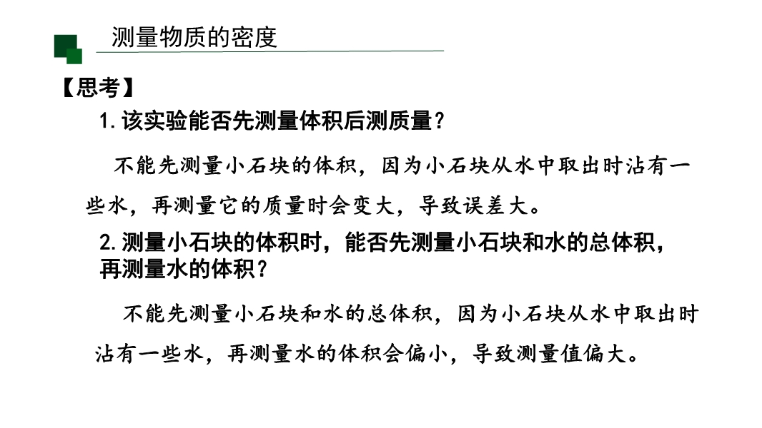 【内容简介】该初中物理课件聚焦“密度知识的应用”,系统涵盖测量固体(如小石块、蜡块)和液体(如食盐水)密度的实验方法、鉴别物质及间接测量物体质量或体积等核心内容。课堂导入通过“知识回顾”梳理密度定义、公式等旧知,结合“思考”提问如何测量不同物质密度,搭建从已有认知到新知探究的学习支架,引导学生逐步深入。其亮点在于以科学探究为核心,通过固体密度测量中的排水法步骤规范、蜡块漂浮的针压/助沉法创新,液体密度测量中方案A(烧杯残留误差)与方案B(改进步骤减误差)的对比分析,培养学生科学思维中的科学论证与质疑创新能力。融入阿基米德鉴别王冠、牛奶密度检测等生活实例,渗透科学态度与责任中的社会责任意识,结构化小结明确密度应用三方面,助力学生构建物理观念中的物质观念,既帮助学生掌握实验技能与问题解决方法,也为教师开展高效实验教学提供清晰路径。