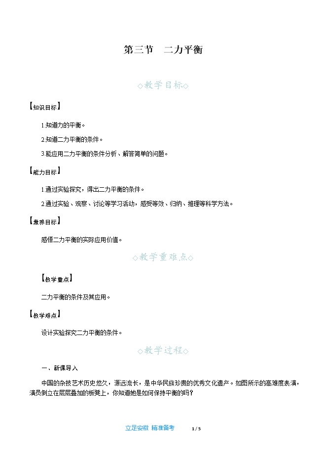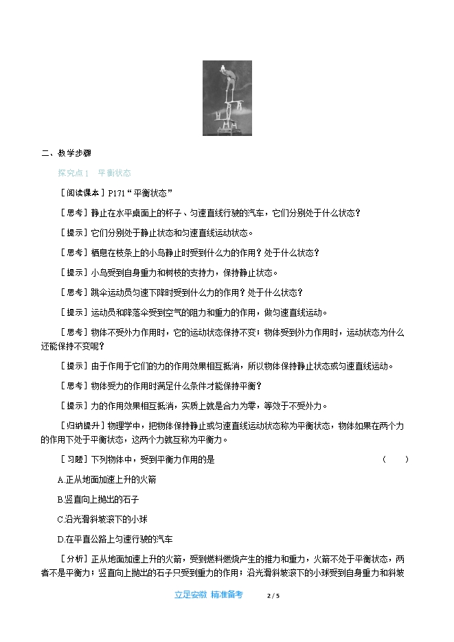 【内容简介】一、新课导入中国的杂技艺术历史悠久,源远流长,是中华民族珍贵的优秀文化遗产。如图所示的高难度表演,演员倒立在层层叠加的板凳上,你知道她是如何保持平衡的吗? 二、教学步骤探究点1 平衡状态[阅读课本]P171“平衡状态”[思考]静止在水平桌面上的杯子、匀速直线行驶的汽车,它们分别处于什么状态?[提示]它们分别处于静止状态和匀速直线运动状态。[思考]栖息在枝条上的小鸟静止时受到什么力的作用?处于什么状态?[提示]小鸟受到自身重力和树枝的支持力,保持静止状态。[思考]跳伞运动员匀速下降时受到什么力的作用?处于什么状态?[提示]运动员和降落伞受到空气的阻力和重力的作用,做匀速直线运动。[思考]物体不受外力作用时,它的运动状态保持不变;物体受到外力作用时,运动状态为什么还能保持不变呢?[提示]由于作用于它们的力的作用效果相互抵消,所以物体保持静止状态或匀速直线运动。[思考]物体受力的作用时满足什么条件才能保持平衡?[提示]力的作用效果相互抵消,实质上就是合力为零,等效于不受外力。[归纳提升]物理学中,把物体保持静止或匀速直线运动状态称为平衡状态,物体如果在两个力的作用下处于平衡状态,这两个力就互称为平衡力。