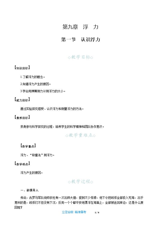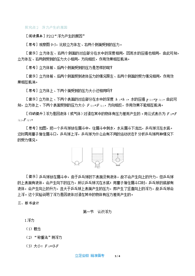 【内容简介】一、新课导入传说,古罗马军队统帅狄杜有一次出师大捷,捉到不少俘虏,他下令把战俘全部投入死海,出乎意料的是,战俘们不但没有下沉,反而一个个都平安地漂浮在海面上,全部被送回岸边,这是什么原因呢? 二、教学步骤探究点1 什么是浮力[阅读课本]P210~211“什么是浮力”[思考]把一铁块挂在弹簧测力计下,然后用手将铁块轻轻托起,弹簧测力计的示数会怎样变化?为什么会这样变化?[提示]由于铁块受到手向上的支持力,故弹簧测力计的示数会变小。[思考]观察图9⁃1,钢铁巨轮为什么能浮在水面上?[提示]浸在水中的物体受到水对其向上的作用力。[思考]观察图9⁃2,热气球为什么能腾空而起?[提示]在空气中的物体受到空气对其向上的作用力。[归纳提升]无论是液体还是气体,对浸入其中的物体都有竖直向上的作用力,物理学中把这个作用力叫做浮力。[思考]观察图9⁃3(a)中石块在空气和水中时弹簧测力计示数的变化。[提示]石块在水中时弹簧测力计的示数比在空气中时弹簧测力计的示数小。[思考]观察图9⁃3(b),用手托起石块,观察弹簧测力计的示数是如何变化的?[提示]用手托起石块时弹簧测力计的示数比在空气中时弹簧测力计的示数小。[思考]通过实验可知,石块在水中受到了浮力的作用,浮力的方向是怎样的?[提示]浮力的方向与重力的方向相反,总是竖直向上。[归纳提升]“称重法”测浮力:先用弹簧测力计在空气中测出物体的重力G,再把物体浸入液体中,读出弹簧测力计的示数F,弹簧测力计两次示数之差就是浸入液体中的物体所受浮力的大小,即F浮=G-F。