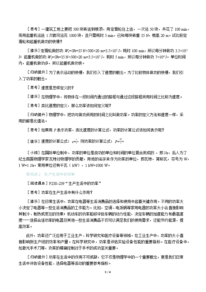 【内容简介】一、新课导入现代化建设的过程中,一座座桥梁,一幢幢大厦,如雨后春笋般拔地而起,在此过程中,现代化机械功不可没,但你知道这些机械的功劳在哪吗? 二、教学步骤探究点1 做功快慢的比较[阅读课本]P237~238“做功快慢的比较”[思考]怎样才算做功?[提示]有力的作用;物体在力的方向上移动一段距离。[思考]阅读图10⁃9,两位搬运工人均从一楼搬运物体到三楼,谁对物体做功快?判断的依据是什么?[提示]将同一物体搬运到同一高度,力对物体做的功相同,但图10⁃9(a)所用的时间少,所以做功快。[思考]阅读图10⁃10,两位搬运工人均从一楼搬运物体到三楼,谁对物体做功快?判断的依据是什么?[提示]两个搬运工人在力的方向上通过相同的距离,且所用时间相同,但图10⁃10(b)搬运的是木箱,人对物体的作用力大,做功多,所以做功快。[思考]比较物体做功快慢需要考虑哪些因素?[提示]必须考虑两个因素:一是物体做了多少功;二是物体做功所用的时间。[思考]比较做功的快慢有哪些方法?[提示]和比较物体运动快慢一样,比较物体做功快慢有两种方法:相同时间比做功的多少;做功相同时比所用的时间。[思考]如果物体运动的路程和时间都不相同,该如何比较物体运动的快慢呢?