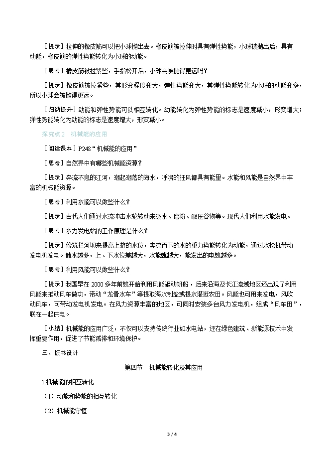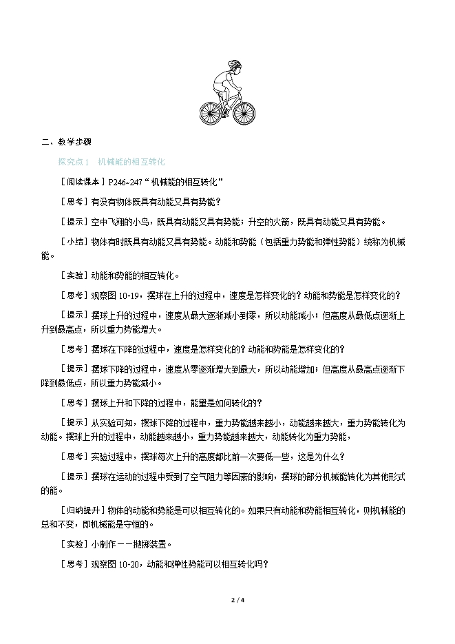 【内容简介】一、新课导入自行车是我们日常生活中经常使用的交通工具,我们使用自行车骑行上下坡的过程中,上坡和下坡时,人和自行车的能量状态如何变化? 二、教学步骤探究点1 机械能的相互转化[阅读课本]P246~247“机械能的相互转化”[思考]有没有物体既具有动能又具有势能?[提示]空中飞翔的小鸟,既具有动能又具有势能;升空的火箭,既具有动能又具有势能。[小结]物体有时既具有动能又具有势能。动能和势能(包括重力势能和弹性势能)统称为机械能。[实验]动能和势能的相互转化。[思考]观察图10⁃19,摆球在上升的过程中,速度是怎样变化的?动能和势能是怎样变化的?[提示]摆球上升的过程中,速度从最大逐渐减小到零,所以动能减小;但高度从最低点逐渐上升到最高点,所以重力势能增大。[思考]摆球在下降的过程中,速度是怎样变化的?动能和势能是怎样变化的?[提示]摆球下降的过程中,速度从零逐渐增大到最大,所以动能增加;但高度从最高点逐渐下降到最低点,所以重力势能减小。[思考]摆球上升和下降的过程中,能量是如何转化的?[提示]从实验可知,摆球下降的过程中,重力势能越来越小,动能越来越大,重力势能转化为动能。摆球上升的过程中,动能越来越小,重力势能越来越大,动能转化为重力势能,[思考]实验过程中,摆球每次上升的高度都比前一次要低一些,这是为什么?