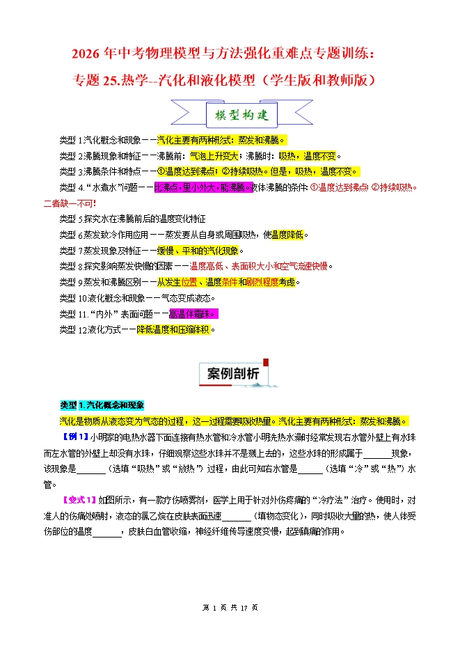 【内容简介】2026年中考物理模型与方法强化重难点专题训练:专题25.热学--汽化和液化模型(学生版和教师版)