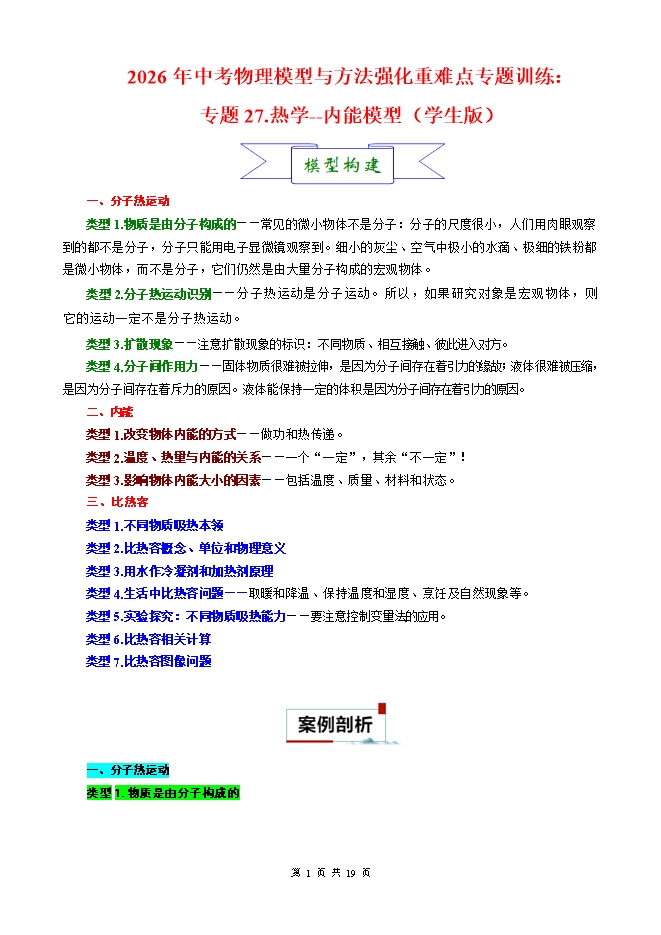 【内容简介】2026年中考物理模型与方法强化重难点专题训练:专题27.热学--内能模型(学生版和教师版)