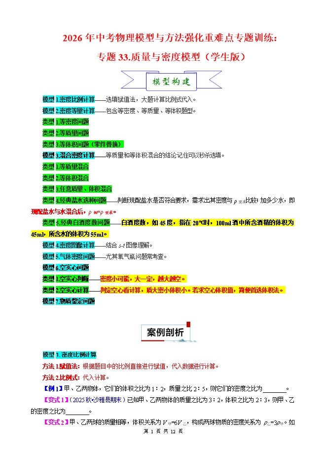【内容简介】2026年中考物理模型与方法强化重难点专题训练:专题33.质量与密度模型(学生版和教师版)
